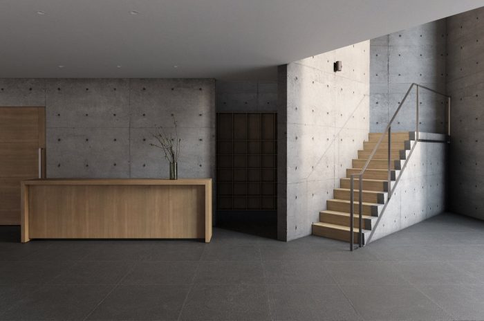 In the reception hall, we created an Oak plywood staircase that rotates 45 degrees to go up to the upper floor, which is a cafe space with natural oak floors. In the context of a fairly densely populated area, with a system of large glass doors and rows of green trees stretching all over the façade outside the living spaces of the upper floors, the building will bring peace and a sense of ease. Bear and relax for the residents inside, they will have a very peaceful place to return to.