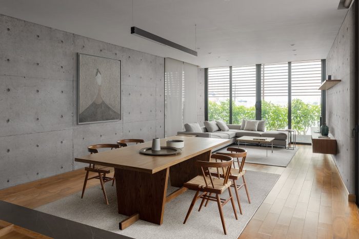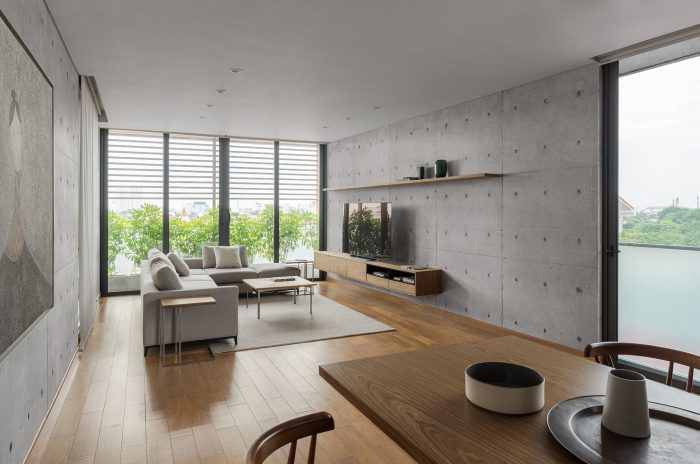 Because the building is located in a humid monsoon tropical climate, in order to cool the house in the summer, the wooden louvers and trees, in addition to contributing beauty to the space of each apartment, will also work its basic is to reduce direct sunlight on large glass panels and cool interior space. The roof has been designed with an extra layer of insulation. It's a layer of mesh and stone is spread over it, creating a gap with the concrete ceiling, allowing heat to be released quickly when the sun goes down.