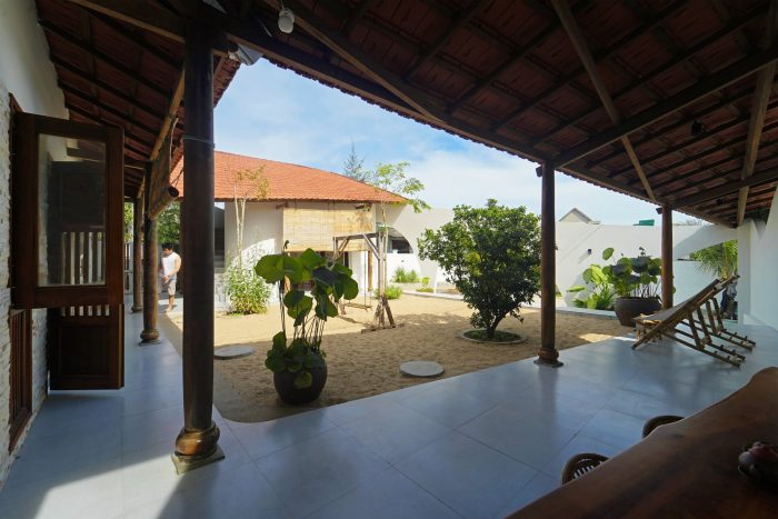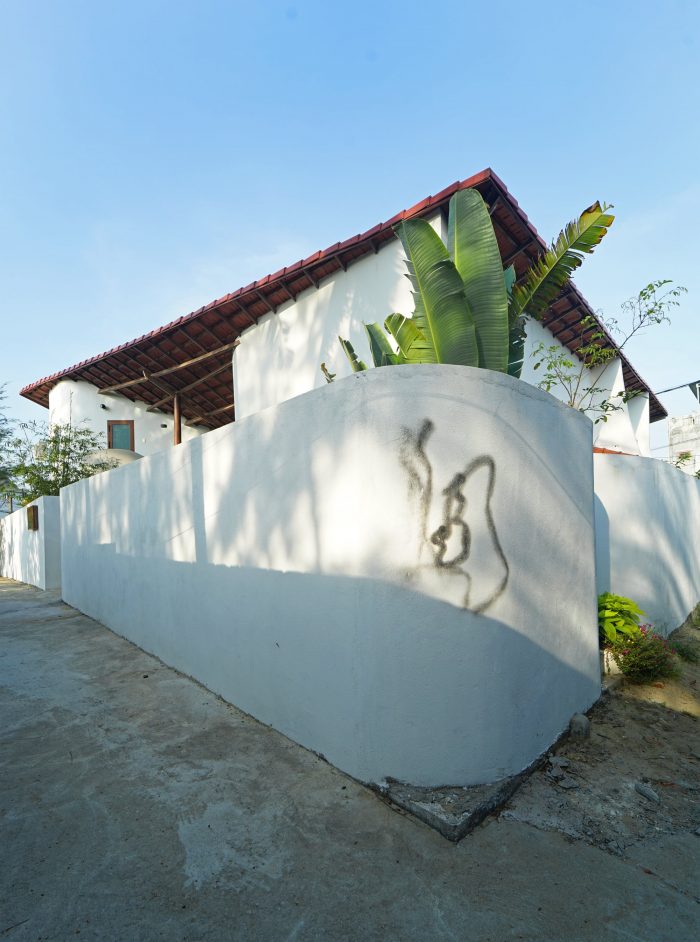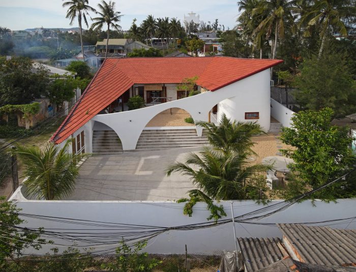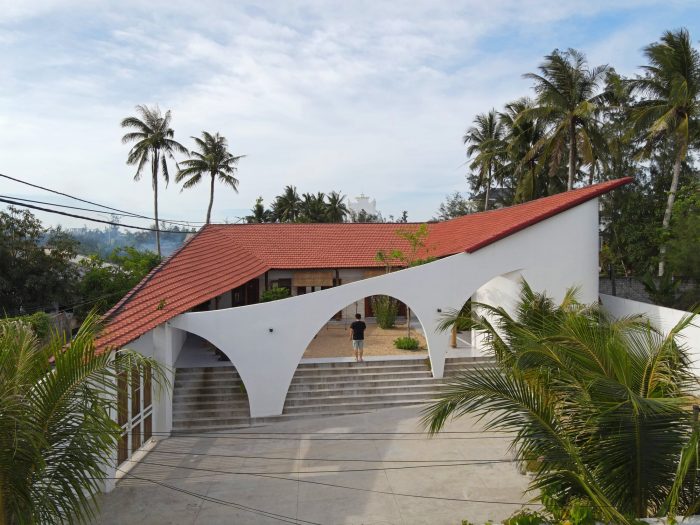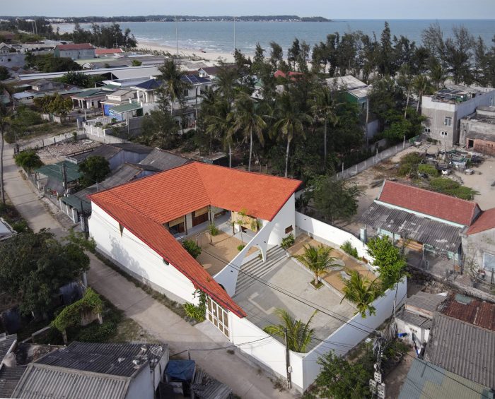 Located in a small fishing village, red tile and sea sand are materials that local people often use to get light from both east and west directions. Thus children can play in the common sand yard and watch the light transform itself from dawn to dusk, stretching like two white and red silks entwined.