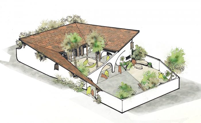 The problem of solving the climate has been taken into consideration first. The building is opened in the direction of the cool wind, the bad sun directions are shielded. Thus, small buffer spaces are created before direct contact with the building, which makes a cool breeze circulate throughout the day.
