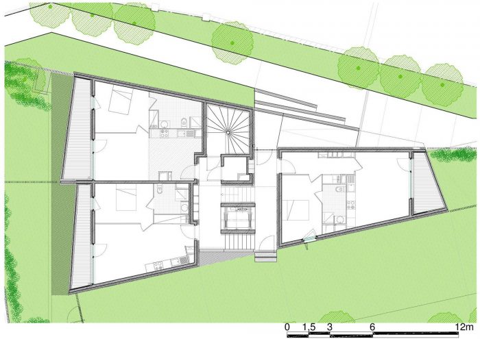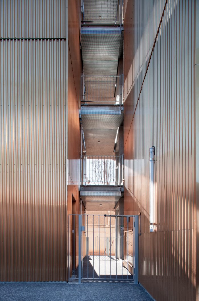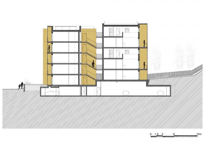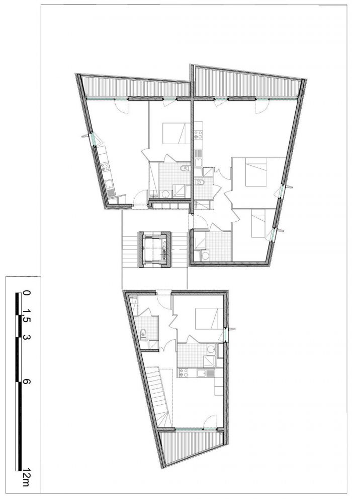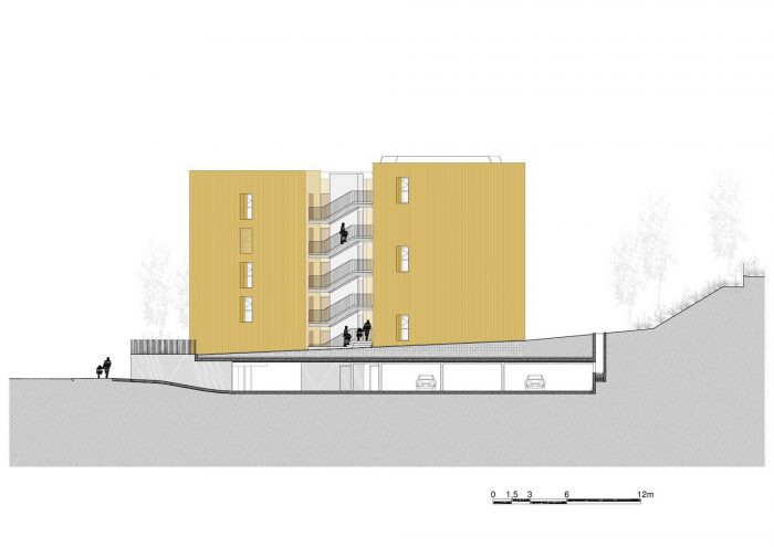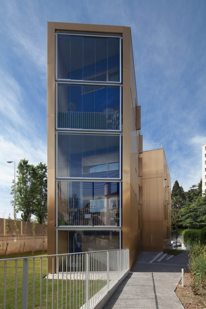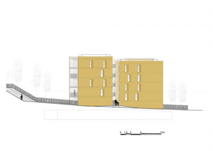 在一个狭小的地块上(1190平方米),有一个非常有限的几何形状,以及由于汽车和火车基础设施造成的强烈的噪音污染,13个住房单元和地下室停车场的建设是由三个四层的集体住宅楼组成,建在一个共同的地下。该项目旨在将场地周围不同尺度的建筑联系起来。