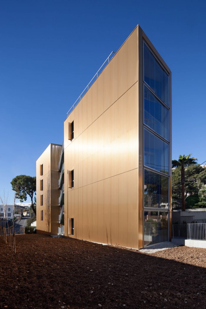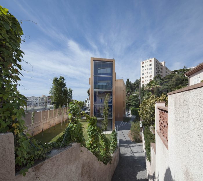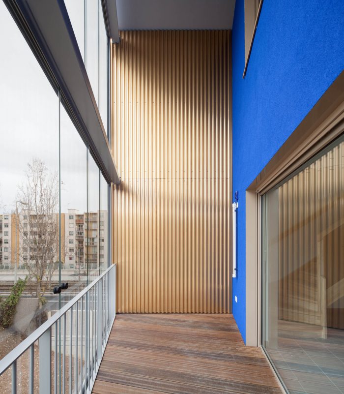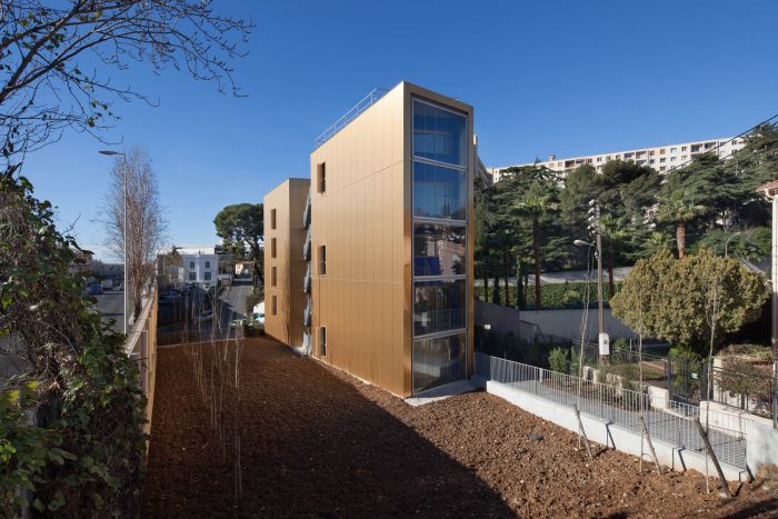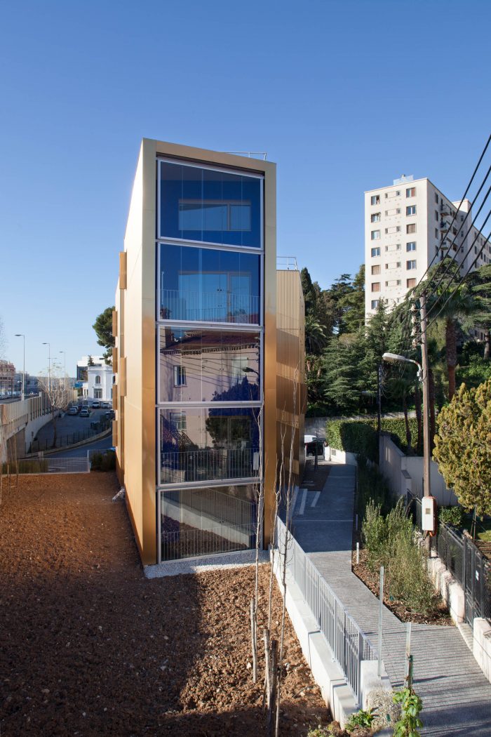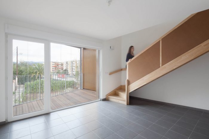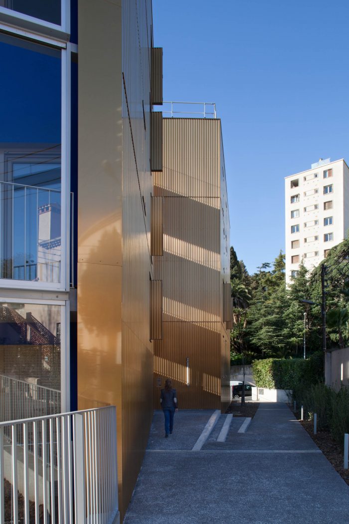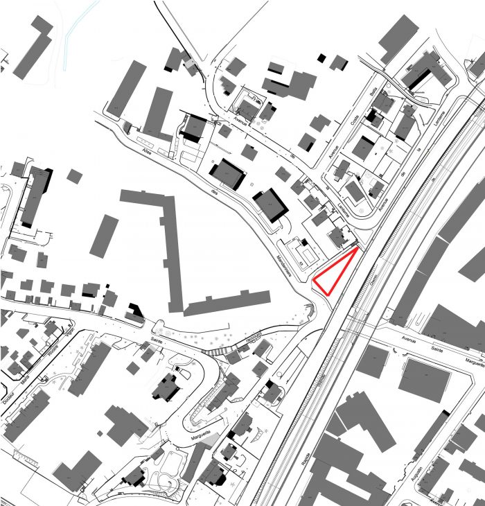 On a confined plot (1190 square meters) with a very constrained geometry and a strong noise pollution due to car and train infrastructures, the construction of 13 housing units and parking in basement is composed of three collective housing blocks of four levels built on a common underground. The project aims to create a connection between the different scales surrounding the site.