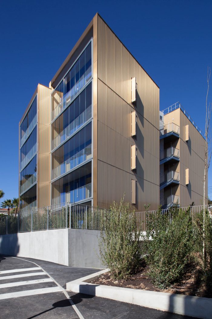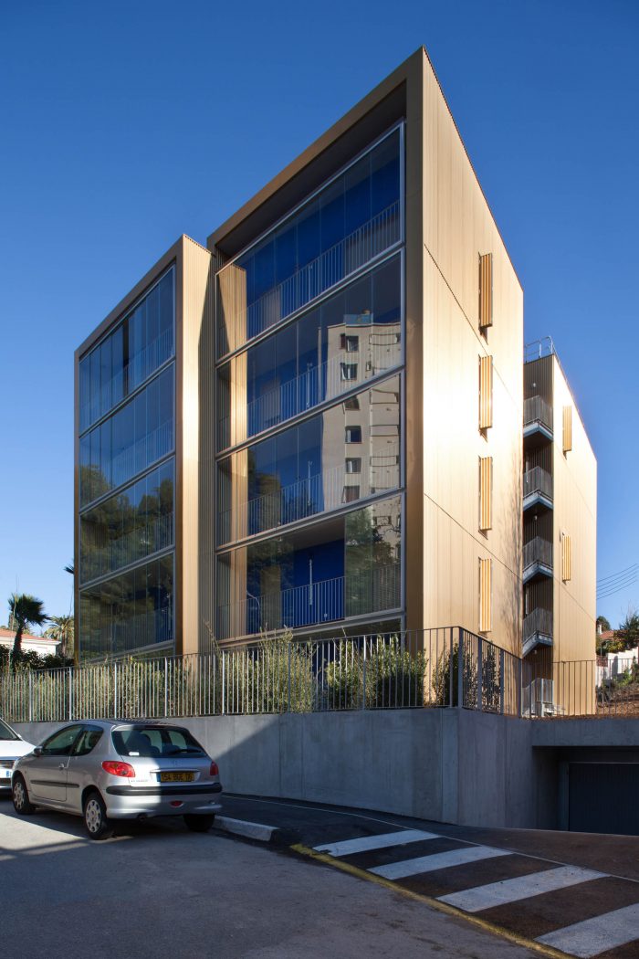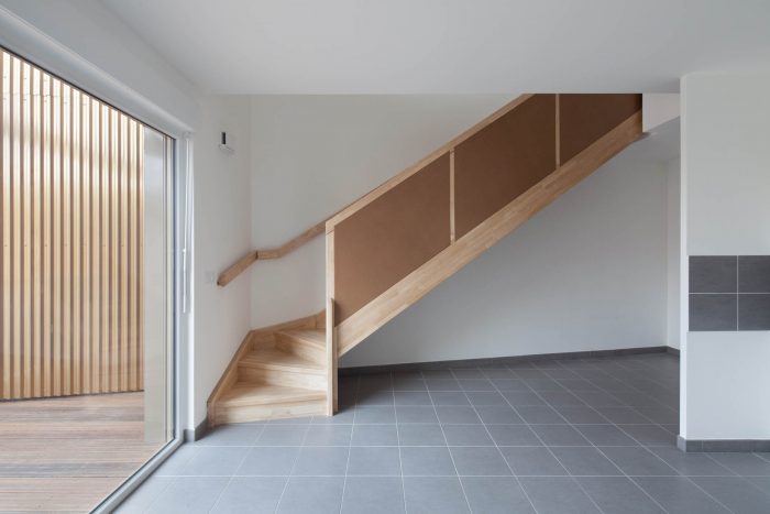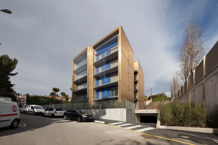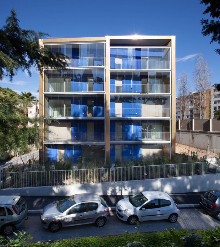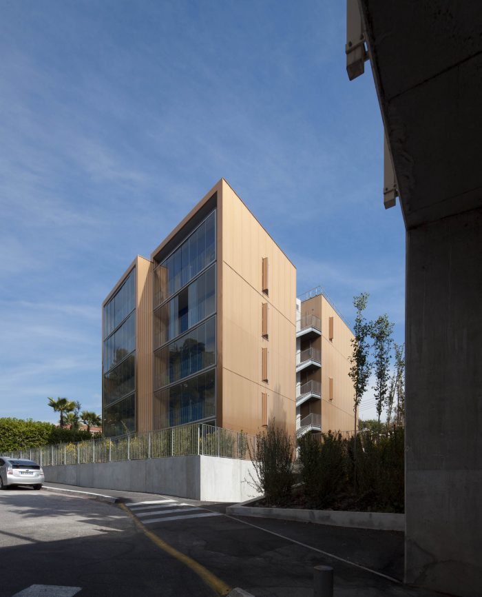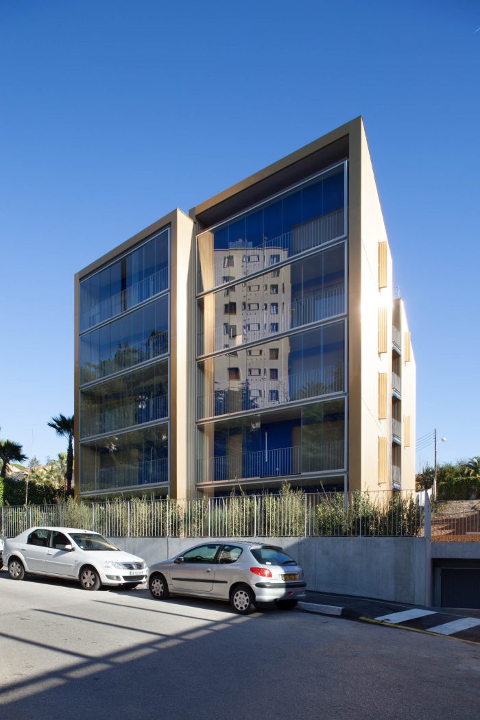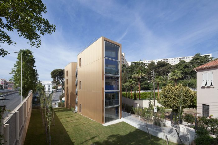 On a confined plot (1190 square meters) with a very constrained geometry and a strong noise pollution due to car and train infrastructures, the construction of 13 housing units and parking in basement is composed of three collective housing blocks of four levels built on a common underground. The project aims to create a connection between the different scales surrounding the site.