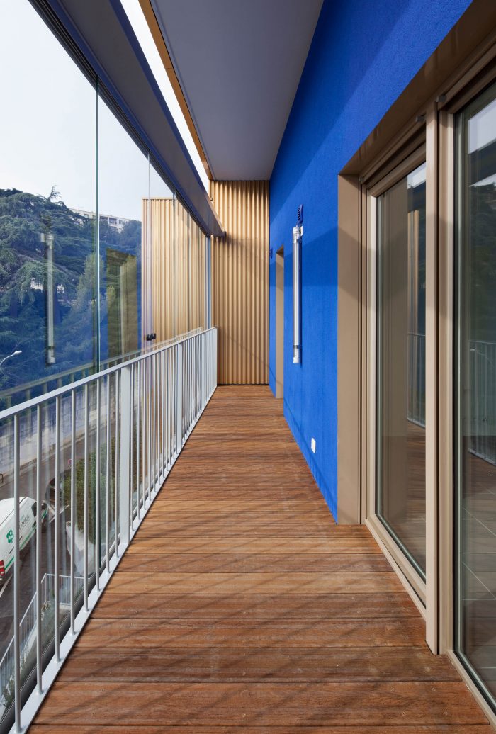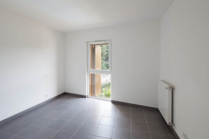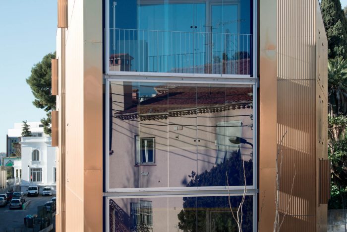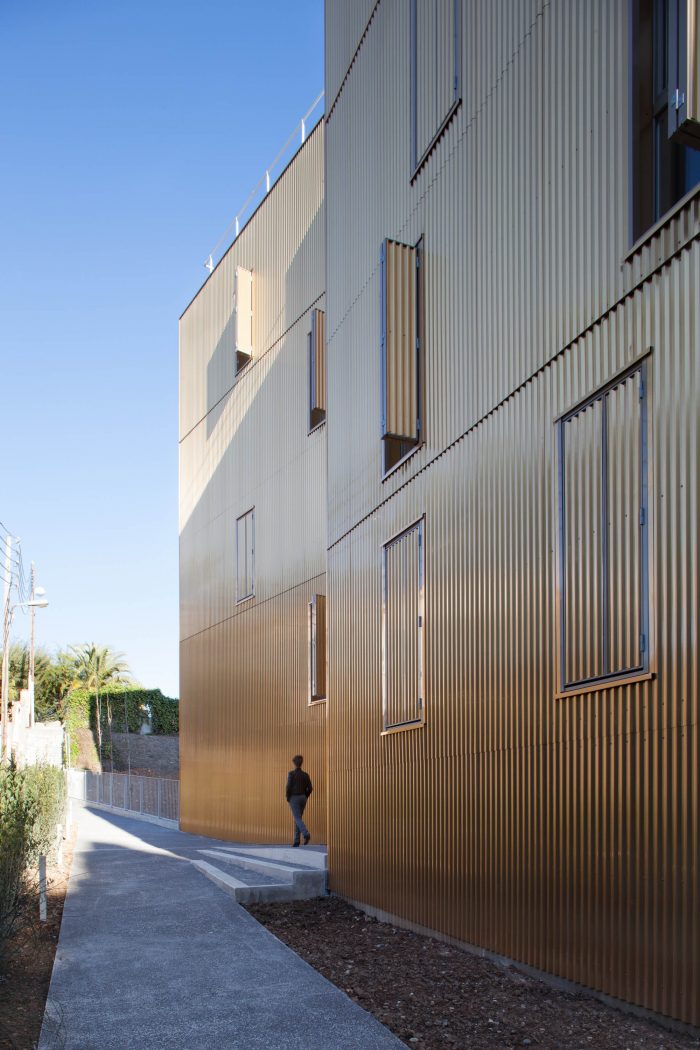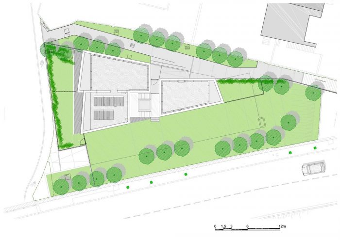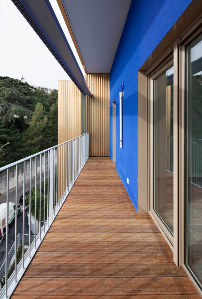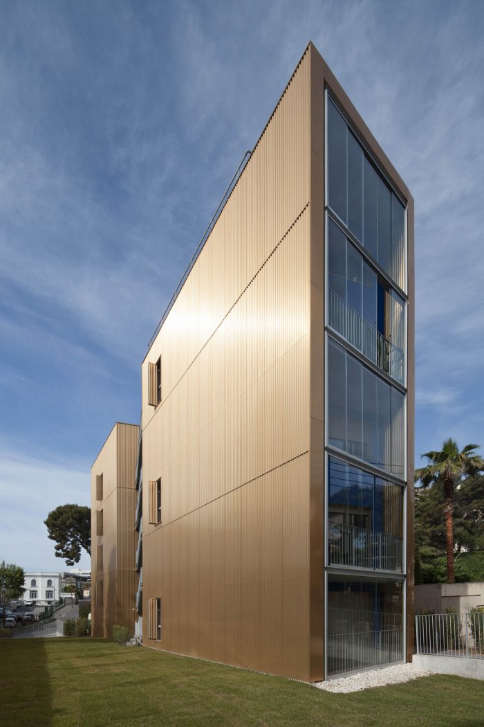 On a confined plot (1190 square meters) with a very constrained geometry and a strong noise pollution due to car and train infrastructures, the construction of 13 housing units and parking in basement is composed of three collective housing blocks of four levels built on a common underground. The project aims to create a connection between the different scales surrounding the site.