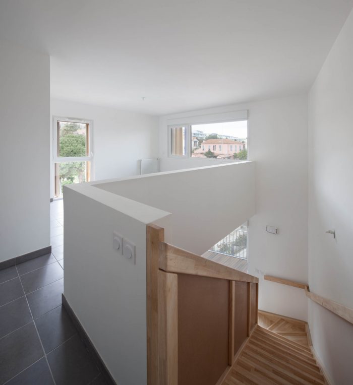 On the top view, the right-of-way of each building is similar to that of individual housing upstream of the site, while on the elevation view, the height and the urban form of the volumes are refering to buildings mainly located on the south of Mathis urban highway.