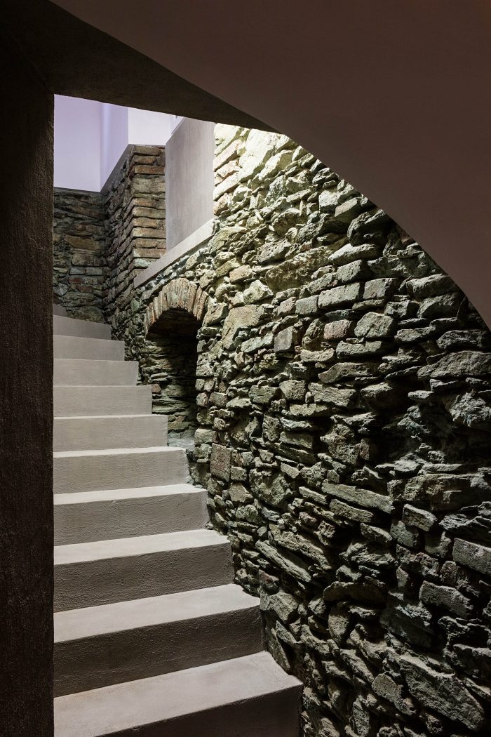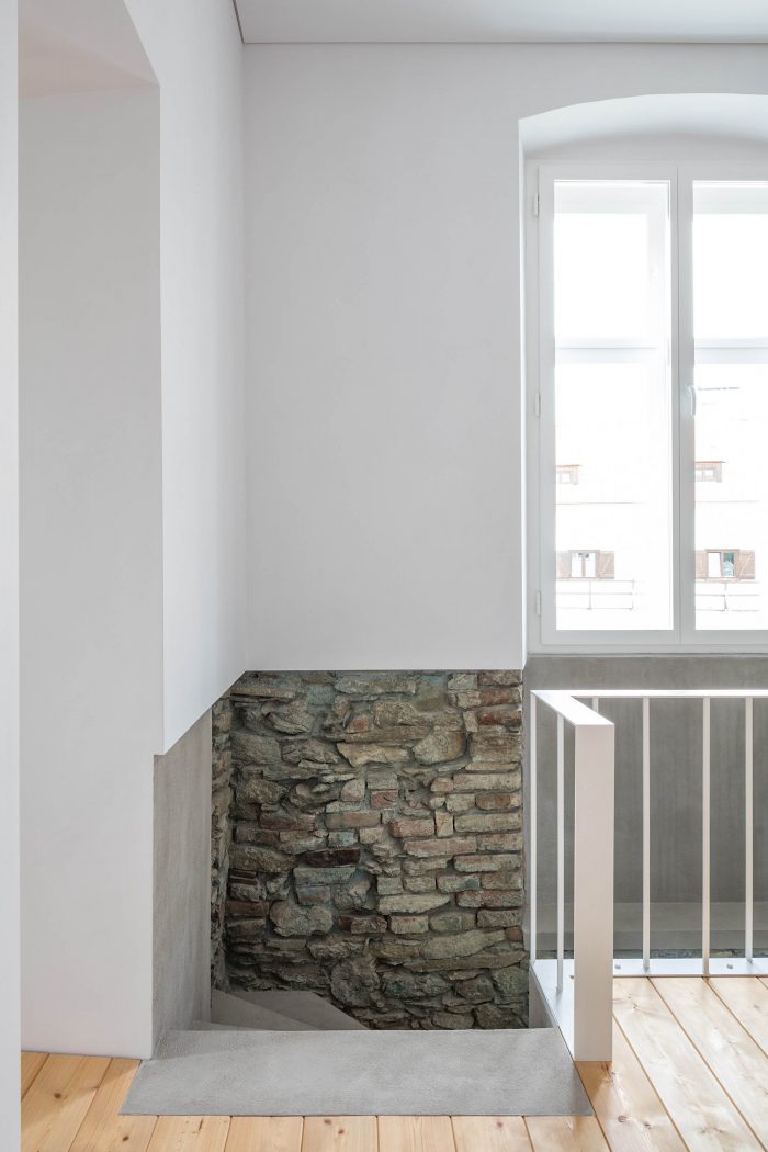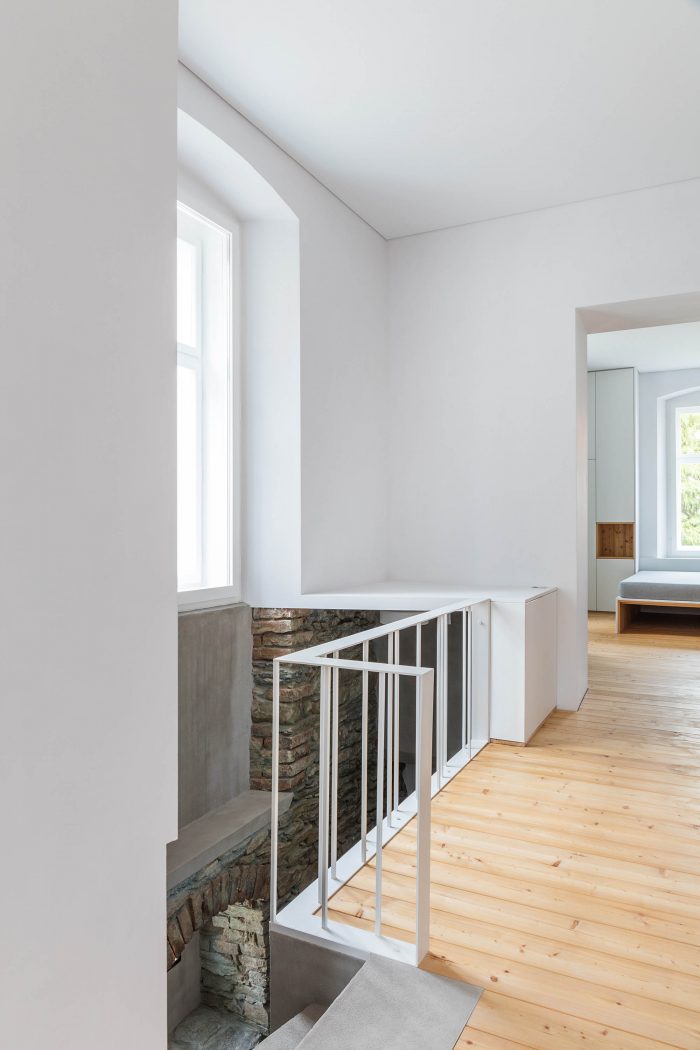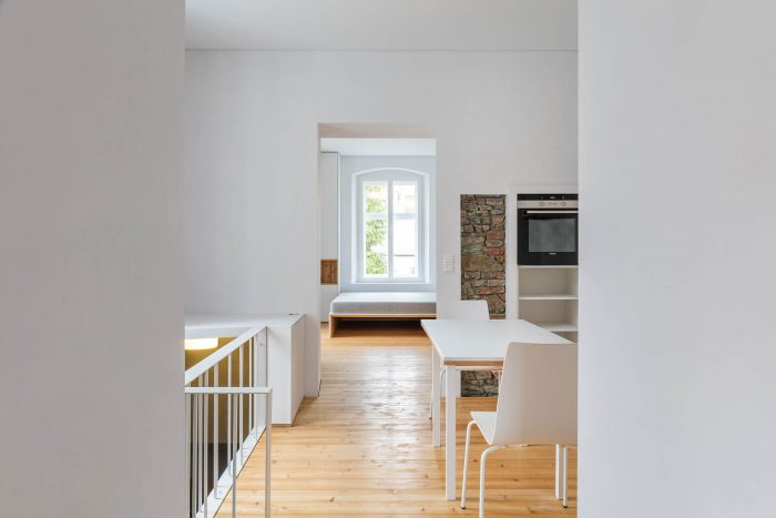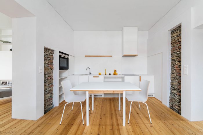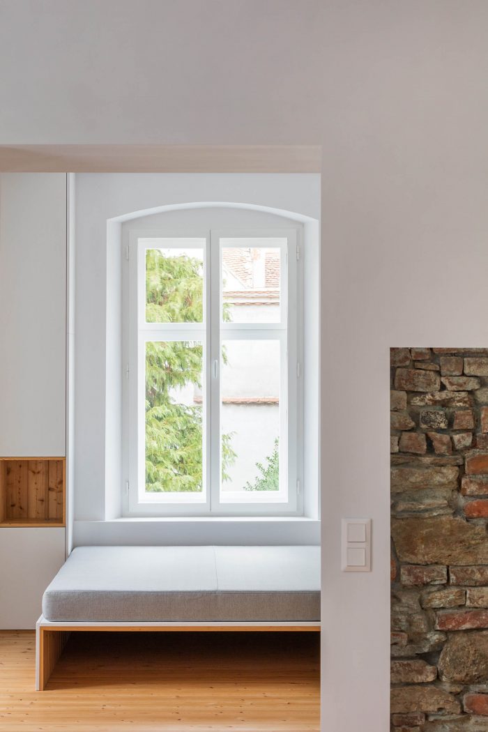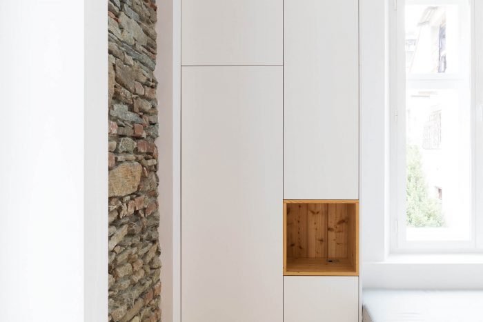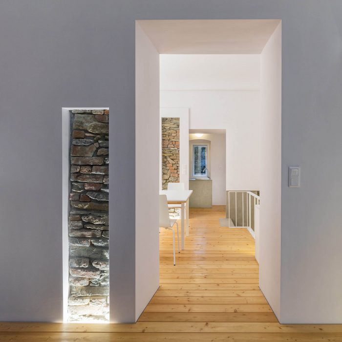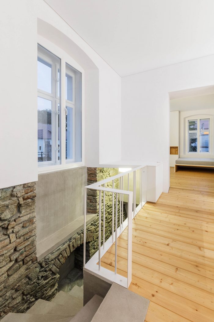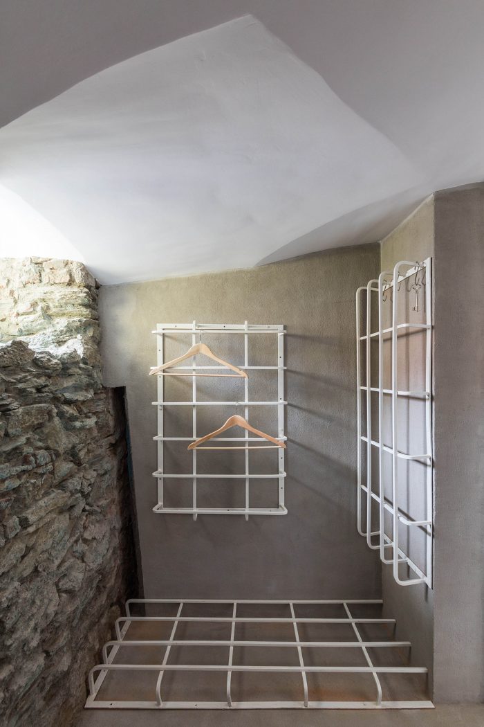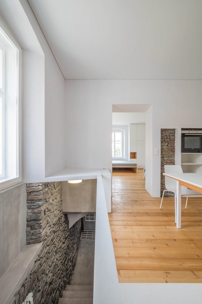 The arrangement of spaces within the apartment is somewhat unusual. Most of the basement is opened to the small private garden. It acts as a filter space between inside and outside combining various functions for all four seasons such as a wine cellar, relaxation space, sauna and storage. At arrival, visitors immediately experience the ancient walls and the heavy vaults that tell stories about the history of the house and the castle district.