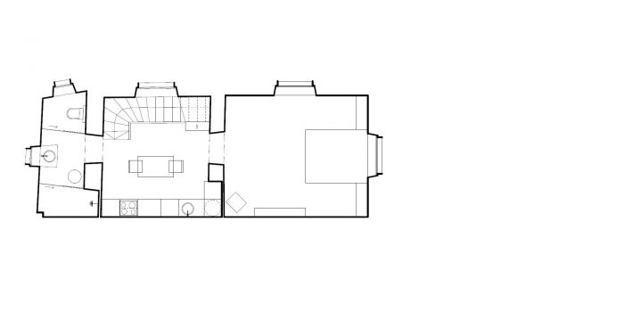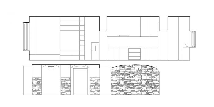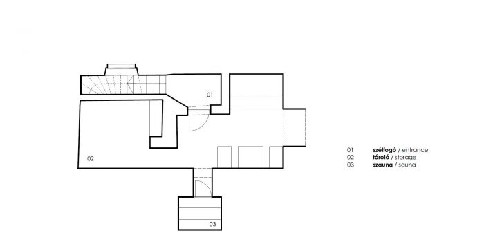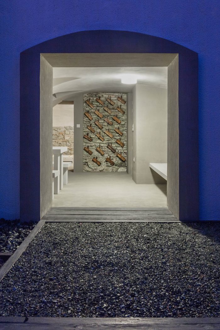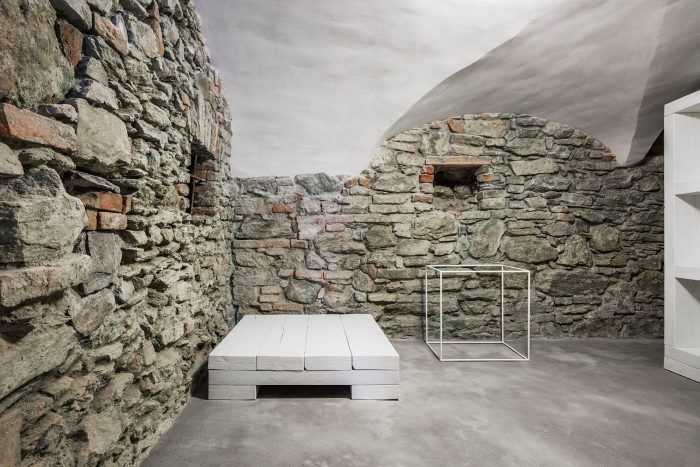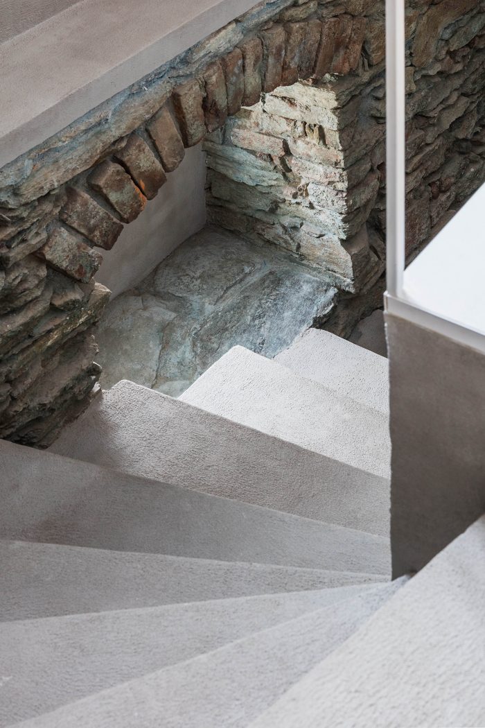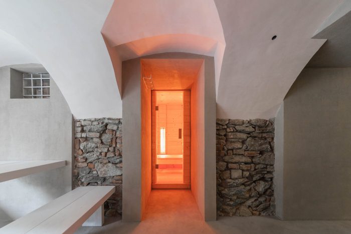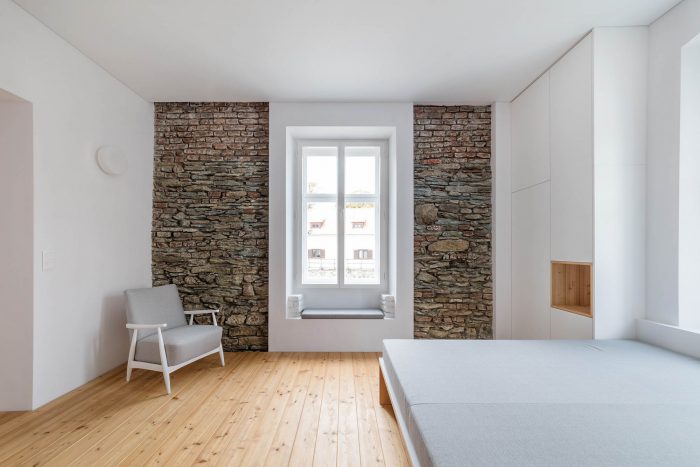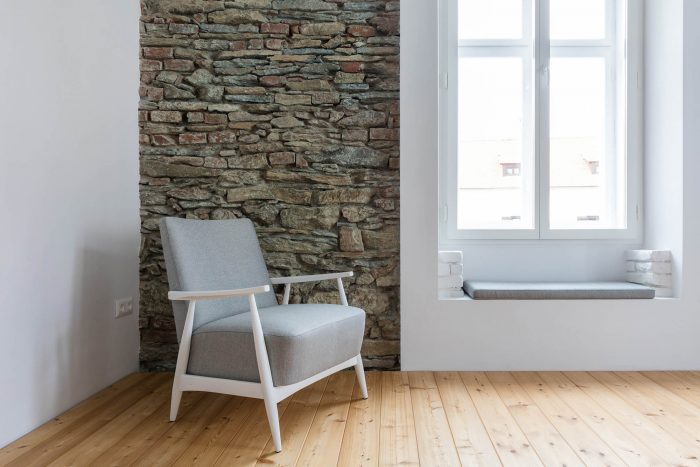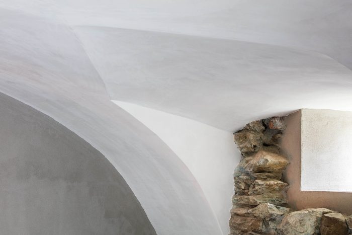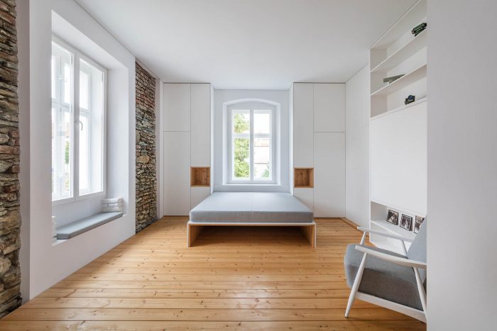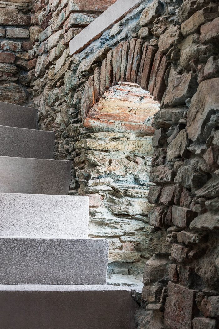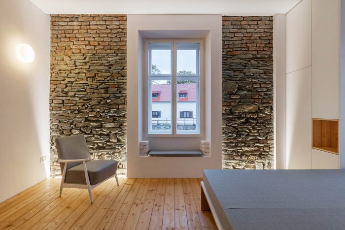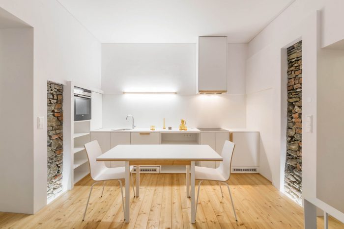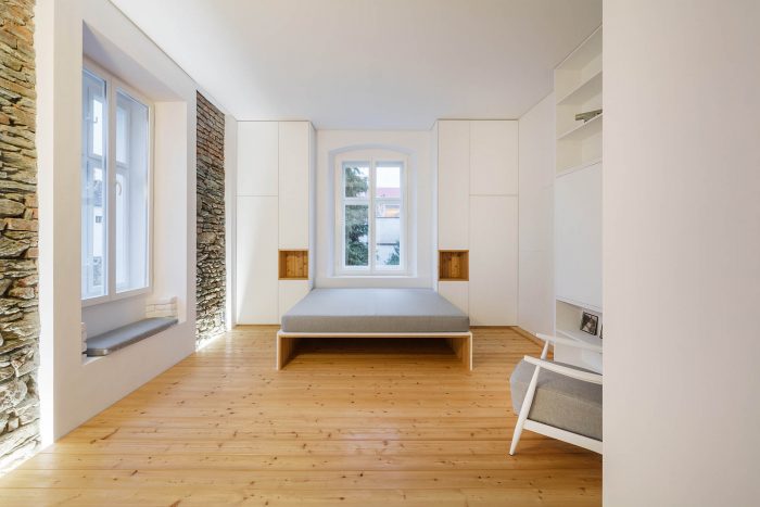 The arrangement of spaces within the apartment is somewhat unusual. Most of the basement is opened to the small private garden. It acts as a filter space between inside and outside combining various functions for all four seasons such as a wine cellar, relaxation space, sauna and storage. At arrival, visitors immediately experience the ancient walls and the heavy vaults that tell stories about the history of the house and the castle district.