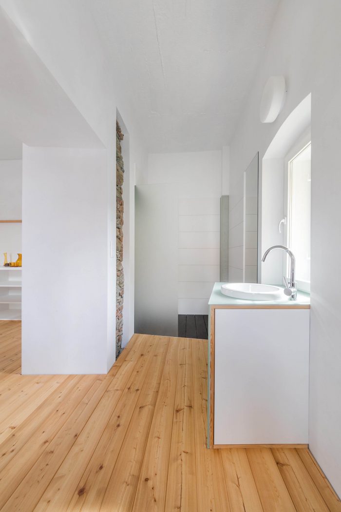 Most of the new surfaces are white, moderate and simple. The oiled larch boards of the flooring return as decorative parts of the built-in furniture. „We used small and simple signs and gestures to link the elements of the space. We defined clear but not harsh boundaries between old and new parts. Silent tones,” says Attila Béres.