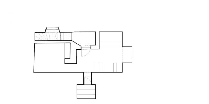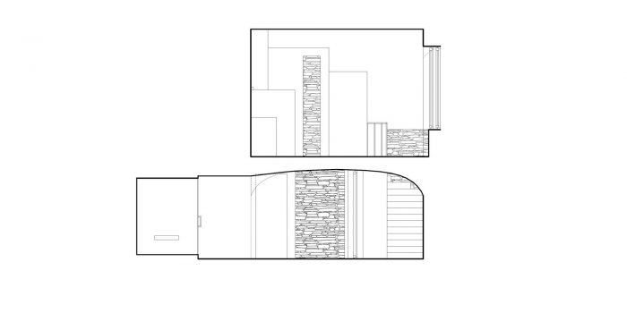 The upper floor consists of 3 main spaces. Framed by the given envelope of the exterior walls, the apartment is divided into a living room-bedroom area, a kitchen-dining area and a bathroom. There are no partition walls or interior doors to separate these spaces. The visual links between the rooms and even the exterior create some sort of classical elegance.