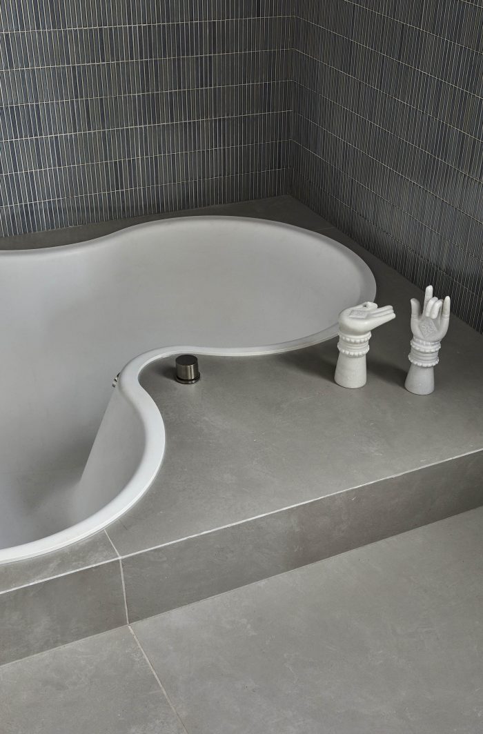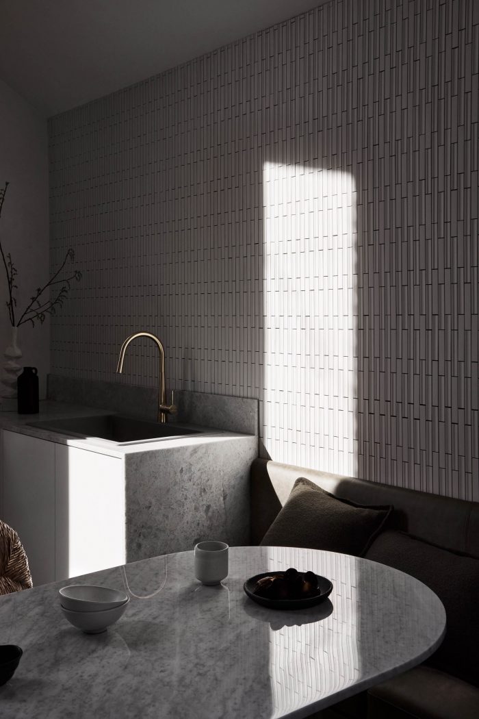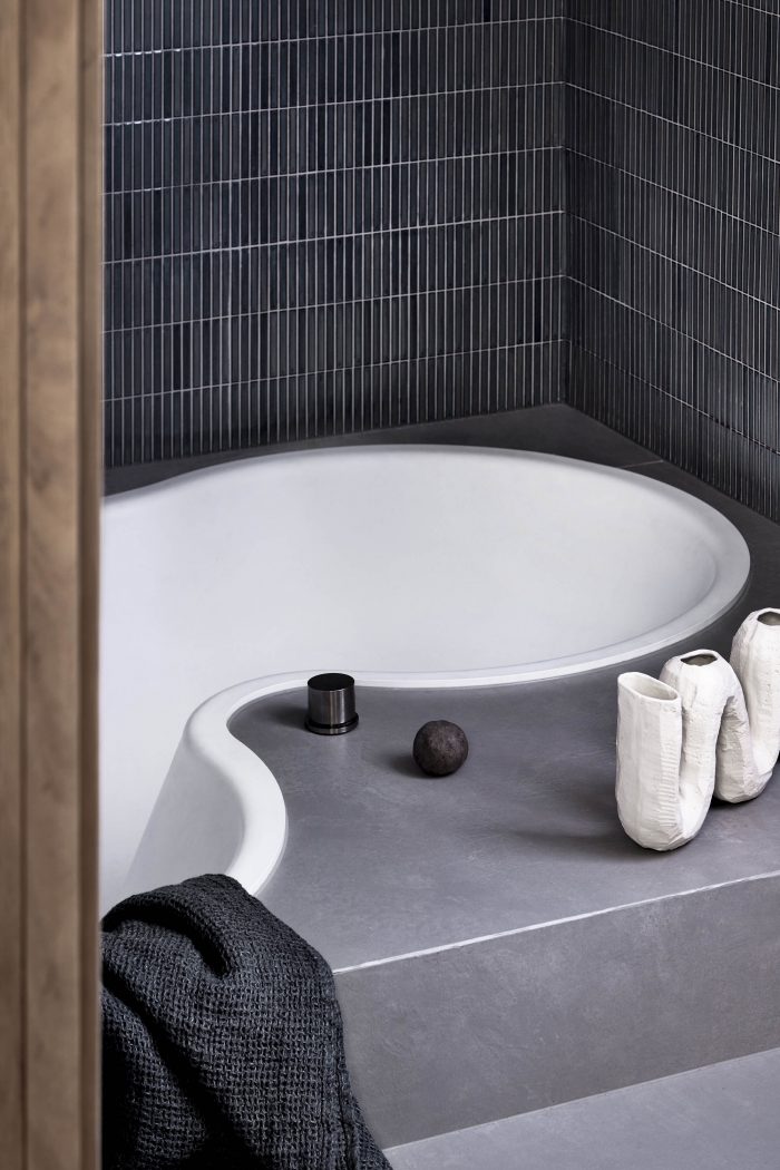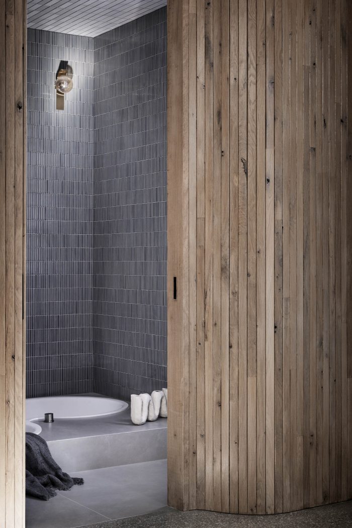 As a corner site, the secondary entrance along the side of the home accesses a walkway between the kitchen/dining and living visually connecting the courtyard to the street. This allows a level of engagement with the street whilst maintaining privacy. The courtyard glazing is completely operable extending the outdoor into the living room. A large sunken curved Agape bath hidden behind timber batten wall next to the living room, is left open during bath-time, for the children to enjoy the whole of the living and courtyard space. The glazed walkway parallel to the courtyard with its high lofty ceiling introduces the high volume of the kitchen. The kitchen is the heart of this home with food and shared eating central to the family. Entering the kitchen, a large north-facing window accentuates the spirit of the kitchen with light filtering the space in all directions. Views to the adjoining trees give a sense of well-being whilst high timber-lined joinery cupboards highlight the extended vertical volume.