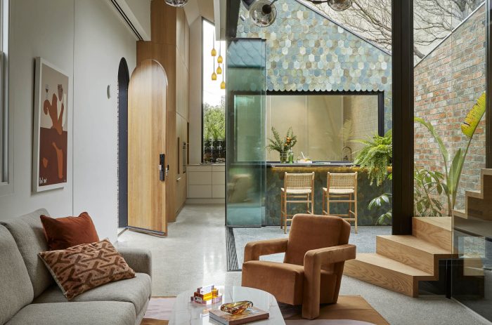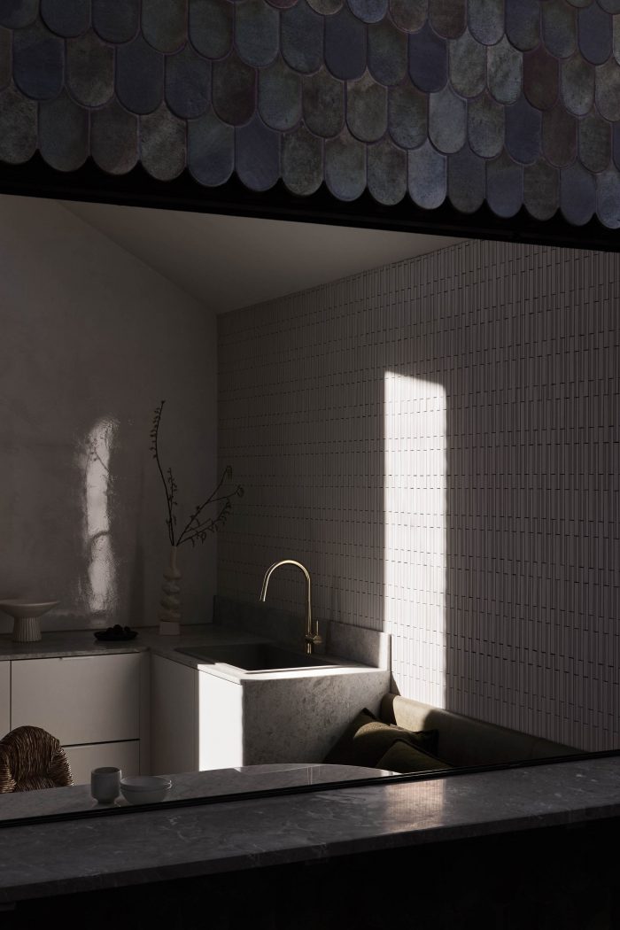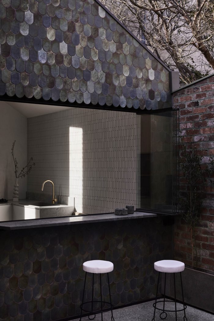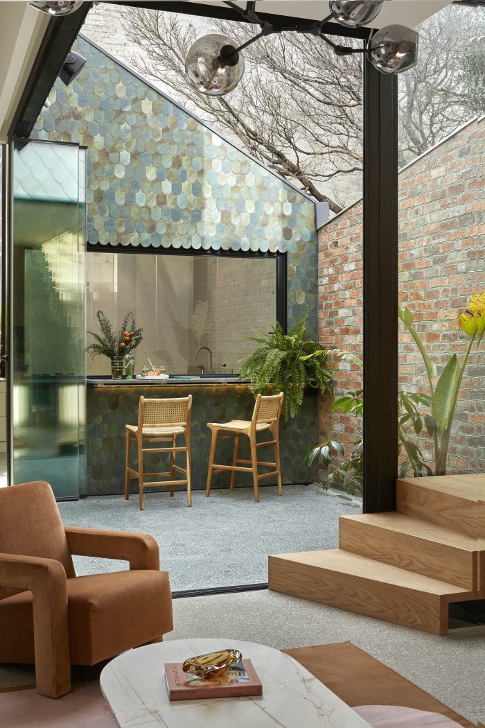 All glazing is orientated to the north or east maximising passive solar gain. The Victorian western windows are maintained located predominately in wet areas. Built as the builder’s own home, the exceptional crafting is evident with the finish of traditional materials throughout. This to be the Italian’s plasterers last project imparting their knowledge of Venetian plastering along the walls, terrazzo concrete floors and the cutting of curved welsh slate tiles to the exterior. The application of Australian and Japanese handmade tiles to wet areas and the courtyard ensure the essence of building traditions in contemporary living is highlighted and maintained.