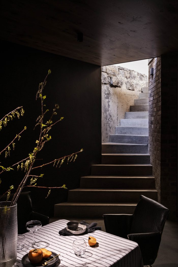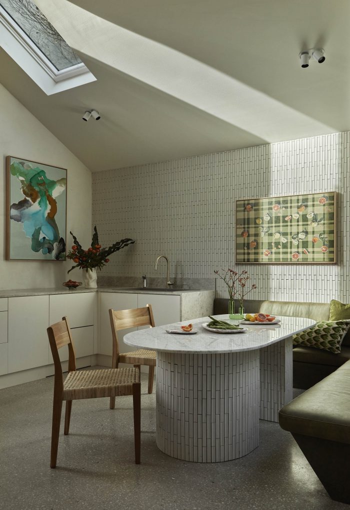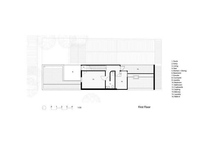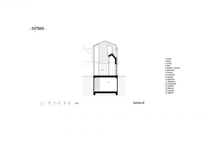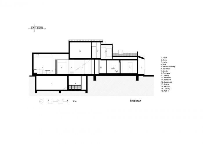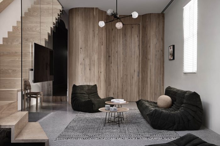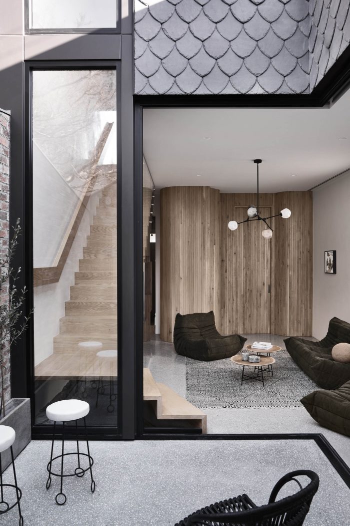 固定的弧形厨房餐桌和长椅适合家人和朋友在晚餐时使用,长椅允许客人在孩子们吃早饭时交际。地下室作为洗衣房、地窖和孩子们的室内游戏区的公用事业区,沿着楼梯往下走,墙壁上有原来的青石基座和原来的砖块,这些砖块排列在院子里,确保地下室被视为这个区域的延伸,院子里的玻璃窗连接到地下室的楼梯和走廊上。木质衬里的地下室天花板创造了温暖,而黑色黑板墙让孩子们在活动中获得快乐。位于住宅前部的父母卧室是一个隐蔽的地方,有一个套间和一个大的步入式长袍,可以让孩子们在进入住宅前脱掉鞋子和物品。