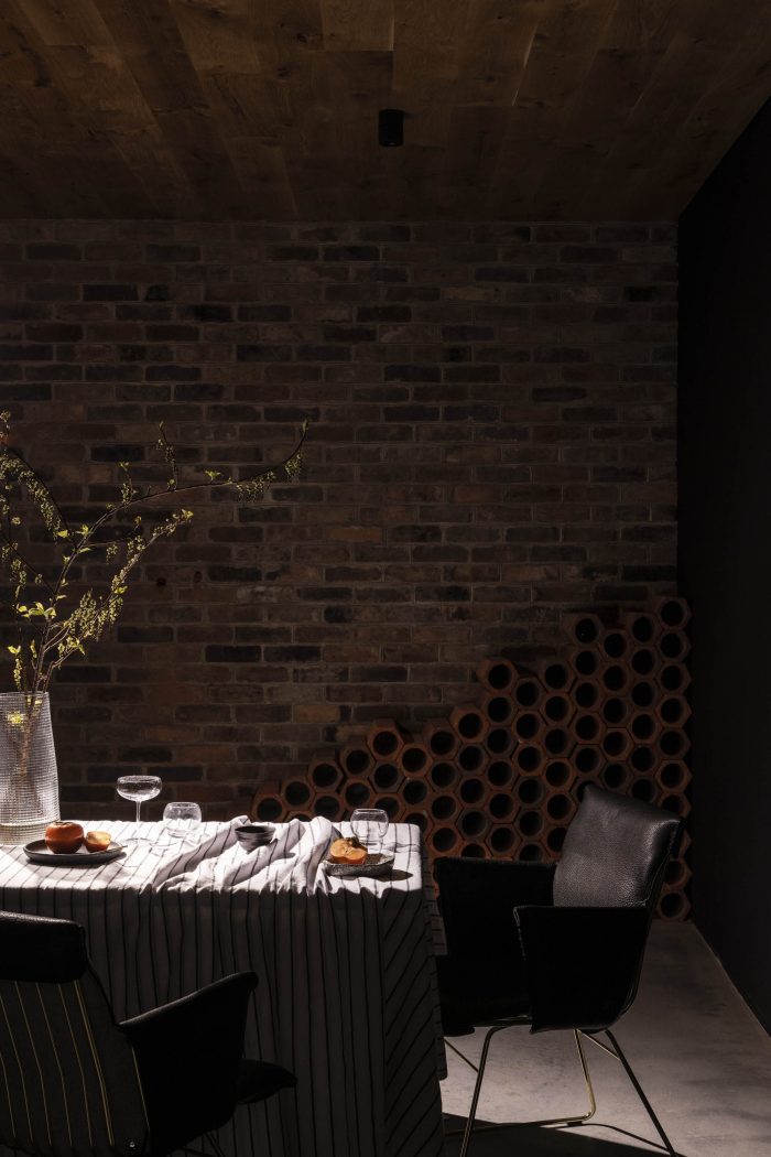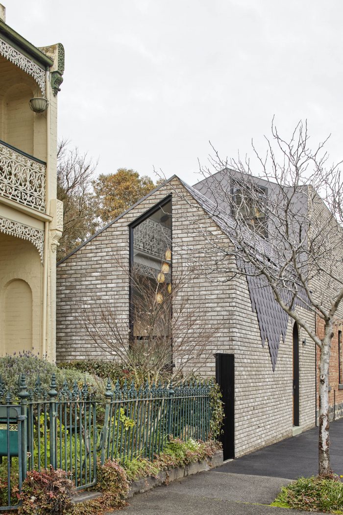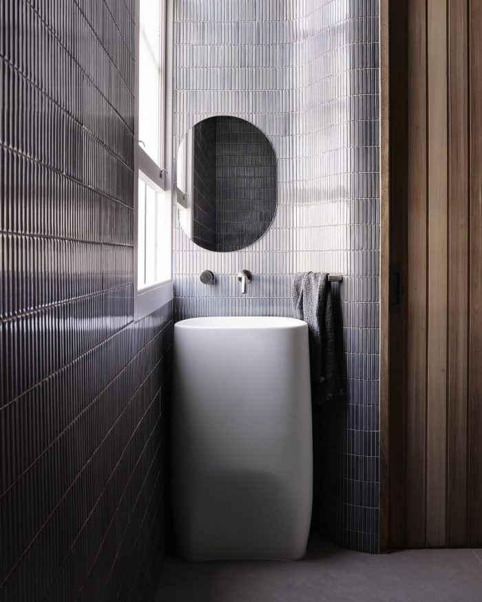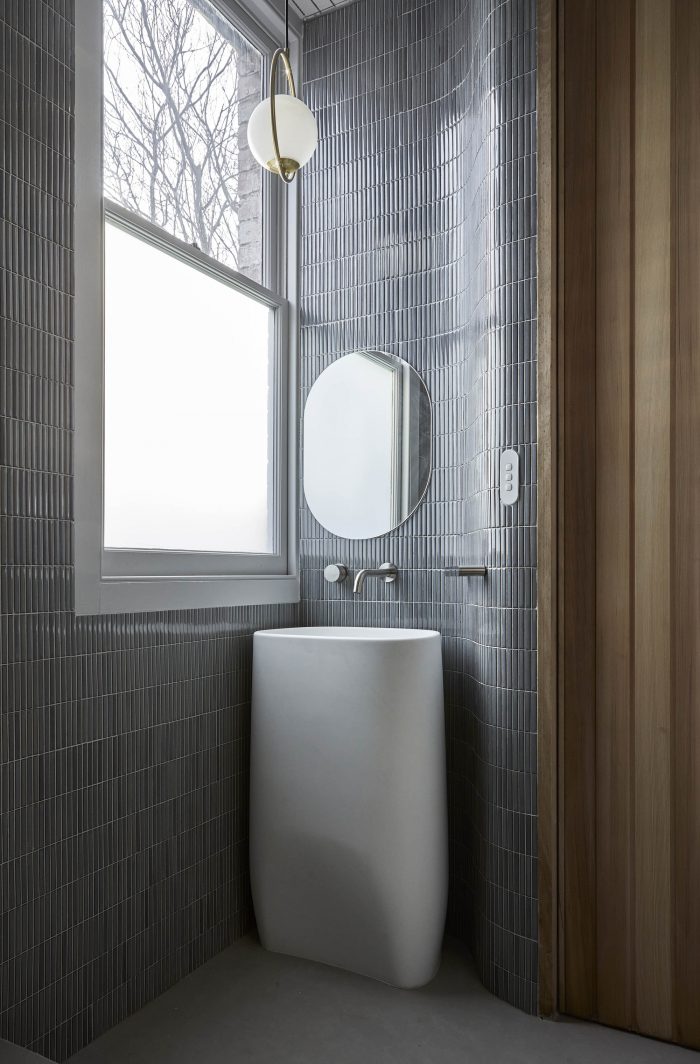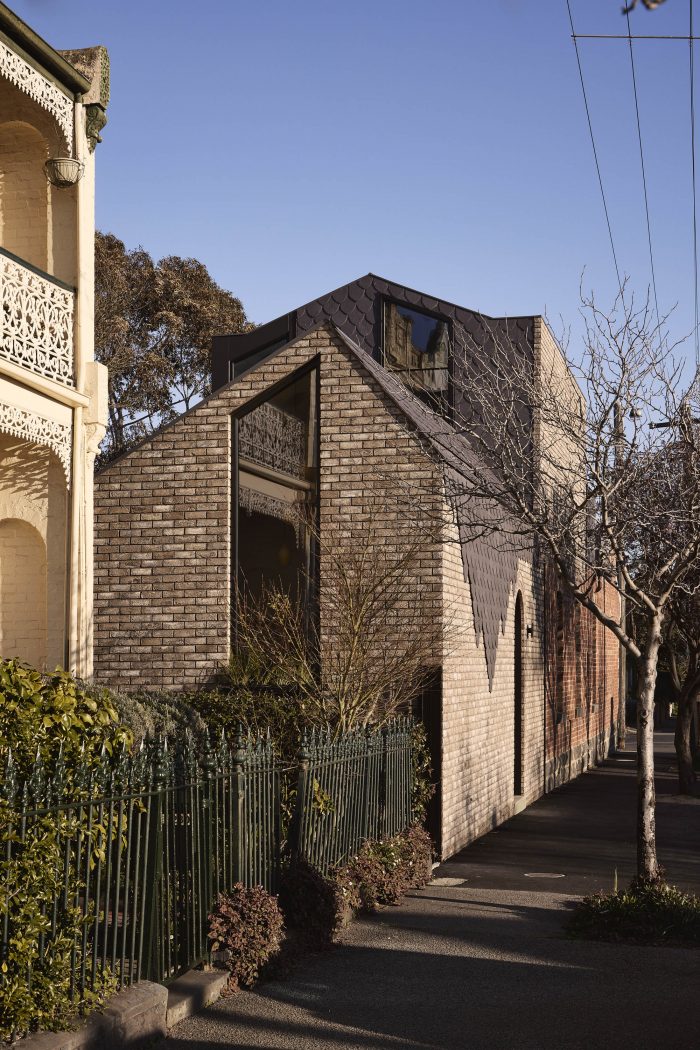 The fixed curved kitchen table and banquette fit the family and friends during dinner time a bench allowing guests to mingle whilst the children have an early dinner. The basement serves as the utility area for laundry, cellar and an indoor play area for the children, descending the stairs the walls are lined with the original bluestone footings and the original bricks from the house which line the courtyard as well ensuring the basement is seen as an extension of this area, glazing from the courtyard connects the basement stairs and hallway beyond. The timber-lined basement ceiling creates warmth whilst the black chalkboard walls allow the children to delight in activity. The parents’ bedroom located at the front of the home is a retreat with an ensuite and a large walk-in robe that accommodates the children to remove shoes and belonging before they enter the home.