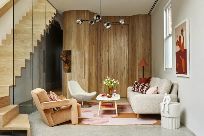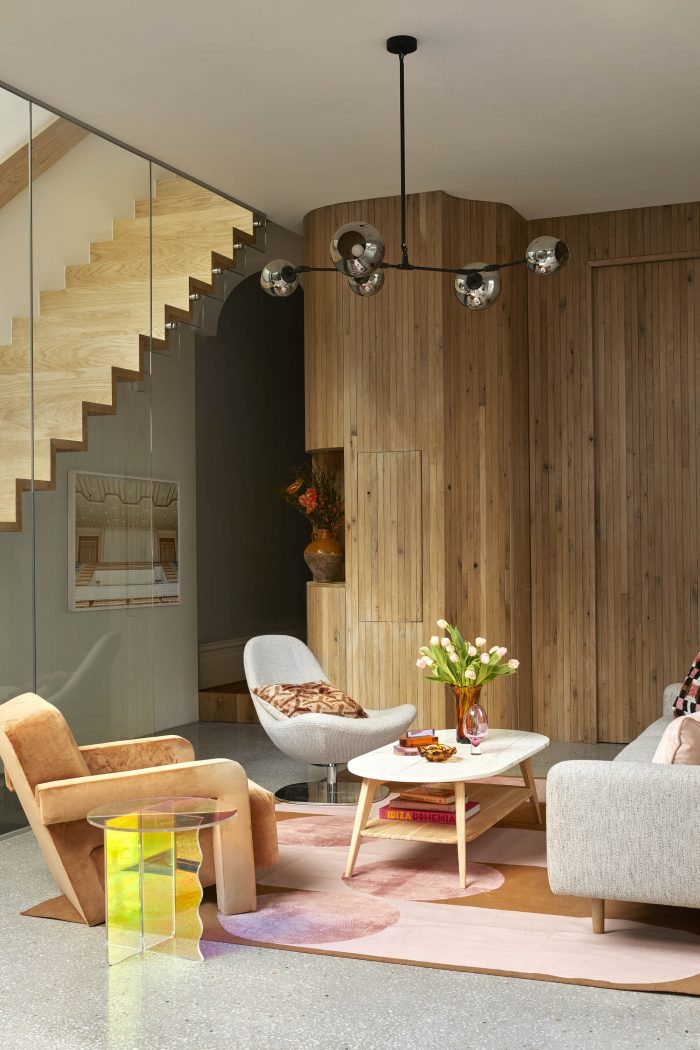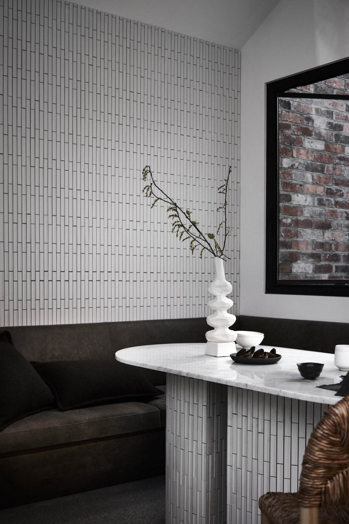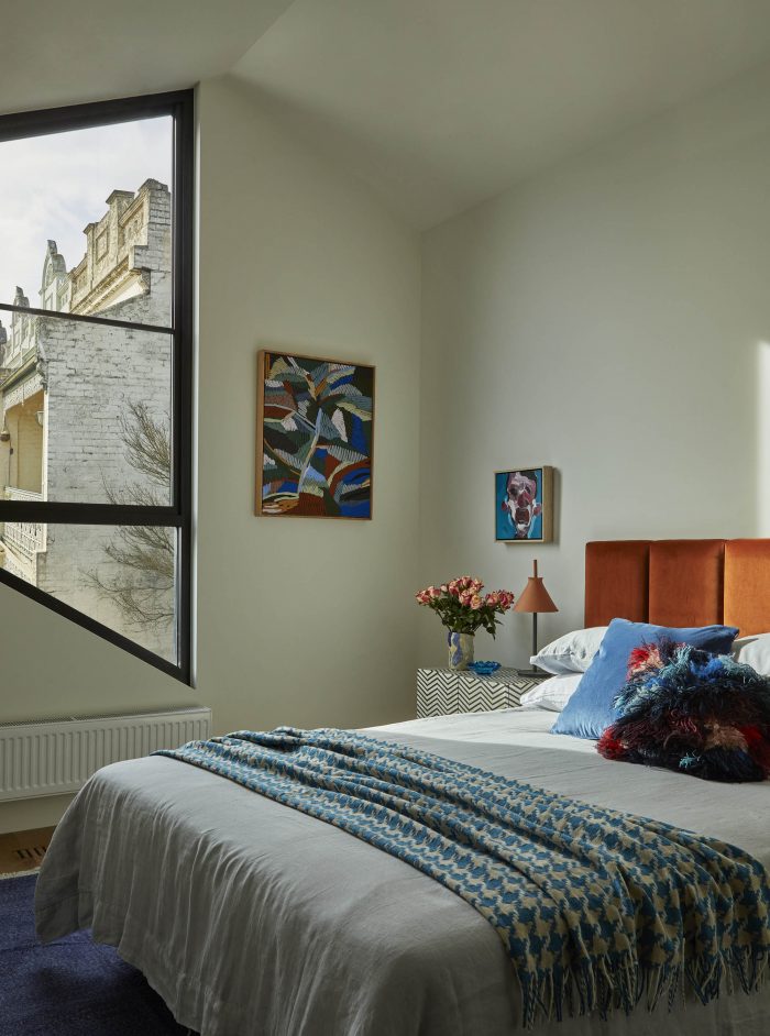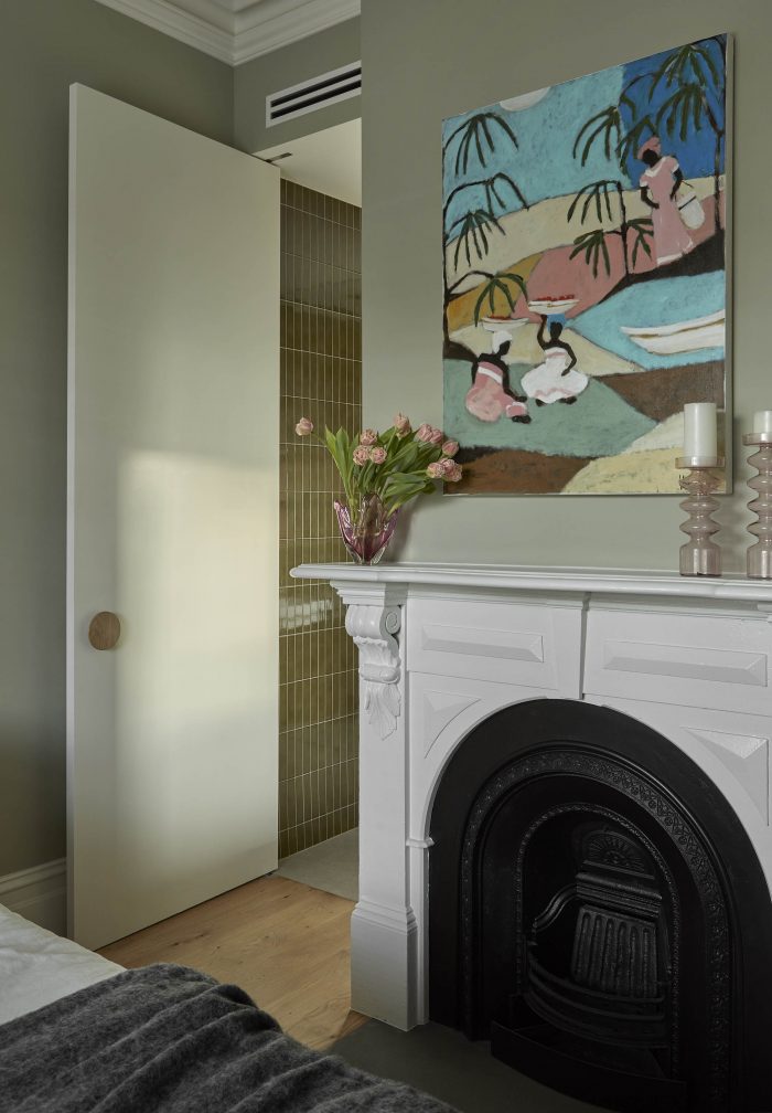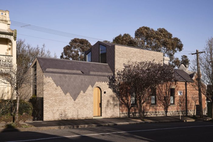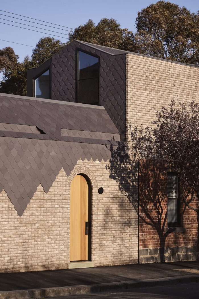 The fixed curved kitchen table and banquette fit the family and friends during dinner time a bench allowing guests to mingle whilst the children have an early dinner. The basement serves as the utility area for laundry, cellar and an indoor play area for the children, descending the stairs the walls are lined with the original bluestone footings and the original bricks from the house which line the courtyard as well ensuring the basement is seen as an extension of this area, glazing from the courtyard connects the basement stairs and hallway beyond. The timber-lined basement ceiling creates warmth whilst the black chalkboard walls allow the children to delight in activity. The parents’ bedroom located at the front of the home is a retreat with an ensuite and a large walk-in robe that accommodates the children to remove shoes and belonging before they enter the home.