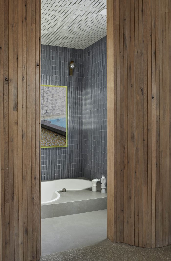 作为一个拐角处,沿着住宅一侧的次要入口可以进入厨房/餐厅和客厅之间的走道,视觉上将院子和街道连接起来。这允许与街道有一定程度的接触,同时保持隐私。院子里的玻璃是完全可操作的,将室外的空间延伸到客厅。客厅旁边的木板墙后面隐藏着一个大的下沉式弧形Agape浴缸,在洗澡的时候是开放的,让孩子们可以享受整个生活和庭院空间。与庭院平行的玻璃走道及其高耸的天花板引入了厨房的高容积。厨房是这个家庭的核心,食物和共享饮食是这个家庭的核心。进入厨房,一个朝北的大窗户突出了厨房的精神,光线从各个方向渗透到空间。毗邻的树木给人一种幸福感,而高大的木质衬里橱柜突出了扩展的垂直体积。