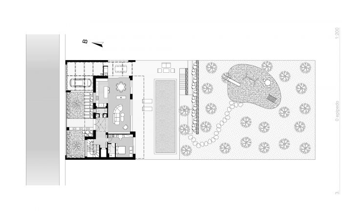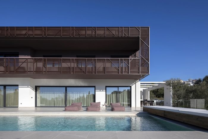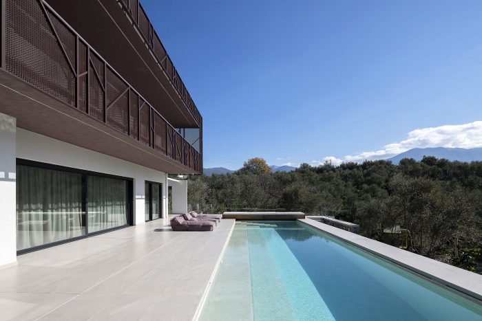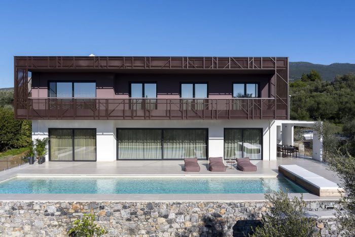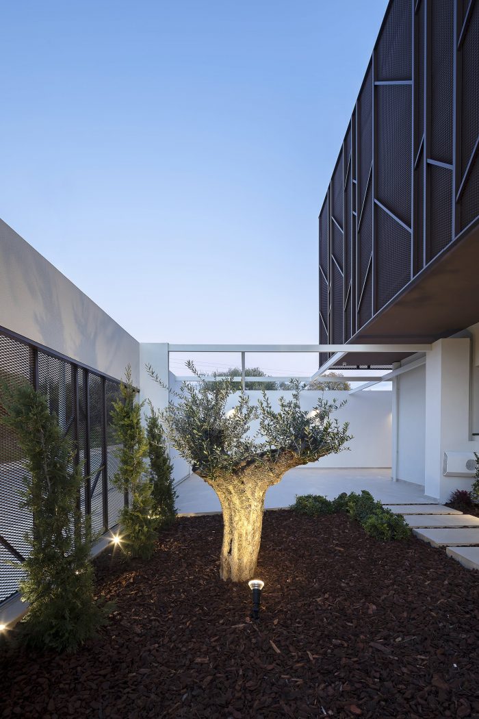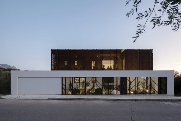 The building is located in Kalamata, Messenia, Greece, inside an extensive olive grove, which is a pocket of nature enclosed within a rapidly growing part of the urban fabric. The street front is treated with a hard limit, acting as a visual barrier to the interior, moving from the city to the domestic, natural environment.