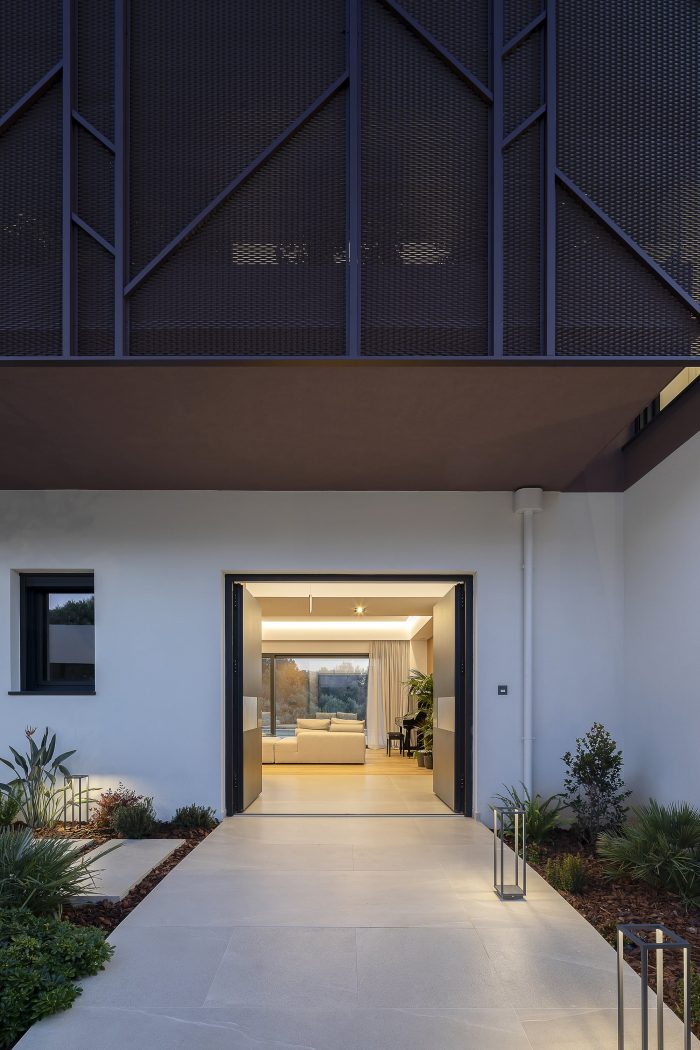 Ultimately, the crowning of the building is materialized in a perforated veil, embracing the private spaces of the house on the upper level like a nest (nidus), perched upon the hard building volumes. The domestic functions are distributed on the three levels as follows: Service uses in the basement, including a cinema room, playroom, utility room, and storage; semi-public uses on the ground floor, which accommodates the living areas and the guest house.