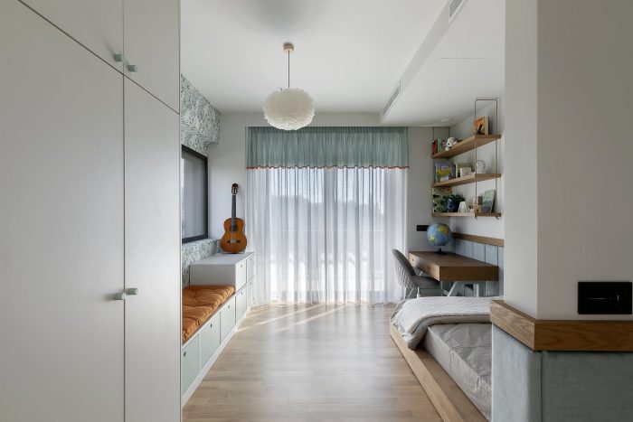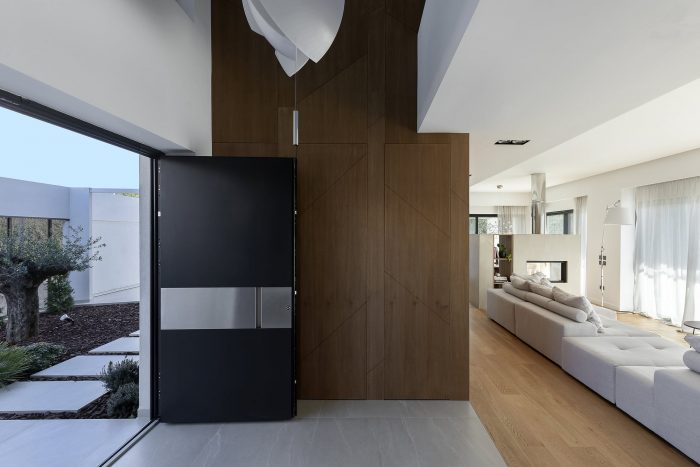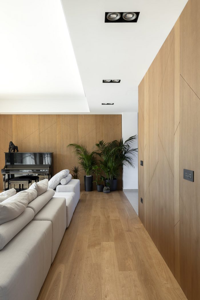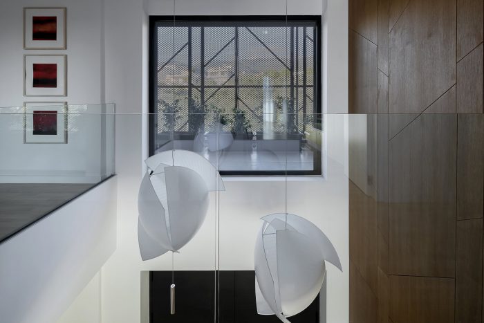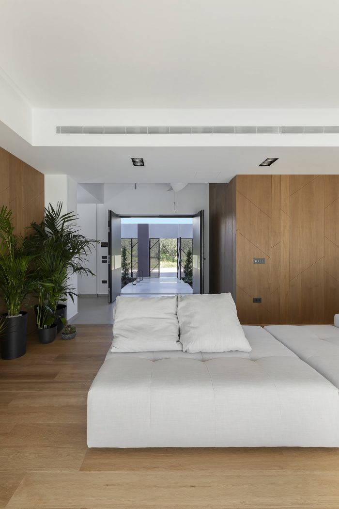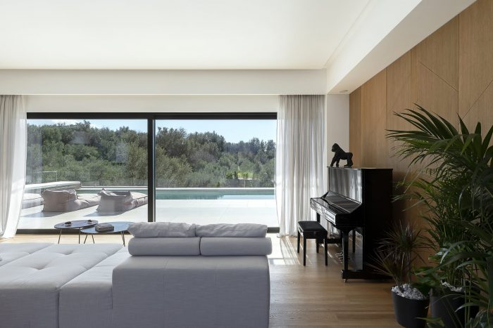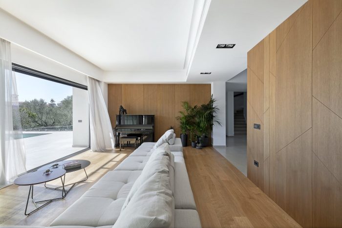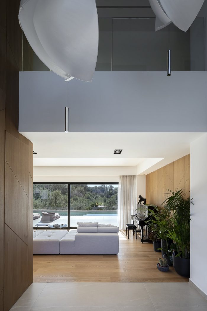 Volumetrically, a game of wooden volumes against the white socle contains functional spaces like the guest WC, wardrobe, and high kitchen cabinets. The motif of "branches" is encountered throughout, as a reference to nature and to the nest, creating a marker of identity and an integrated aesthetic along spaces with a different functions. Oversize openings enhance contact with the environment and have a beneficial impact on the house’s interior climate, providing heat during the winter months, and keeping out solar radiation during the summer, when the sun is at a higher level, with the aid of adequately dimensioned eaves and balconies.