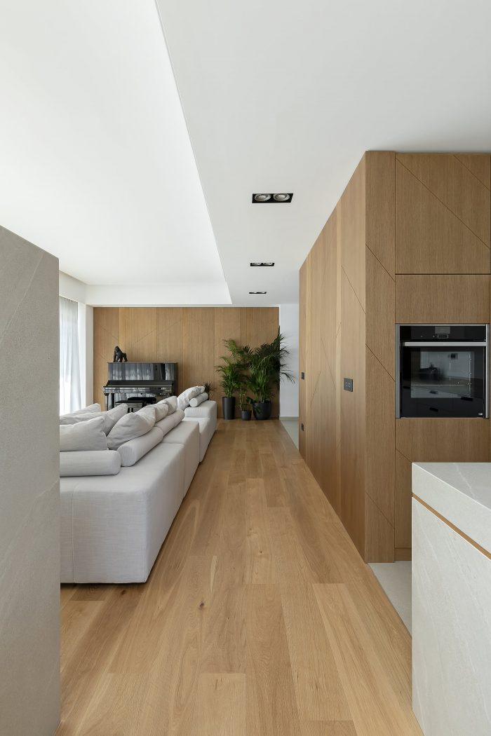 从体量上看,在白色主体的衬托下,木质体量的游戏包含了一些功能空间,如客用卫生间、衣柜和高高的厨房柜子。树枝 "的主题贯穿始终,作为对自然和巢穴的参考,在具有不同功能的空间中创造了一个身份的标志和一种综合的审美。超大的开口加强了与环境的接触,并对房屋的内部气候产生了有益的影响,在冬季提供热量,并在夏季,当太阳处于较高的水平时,借助适当尺寸的屋檐和阳台,阻挡太阳辐射。