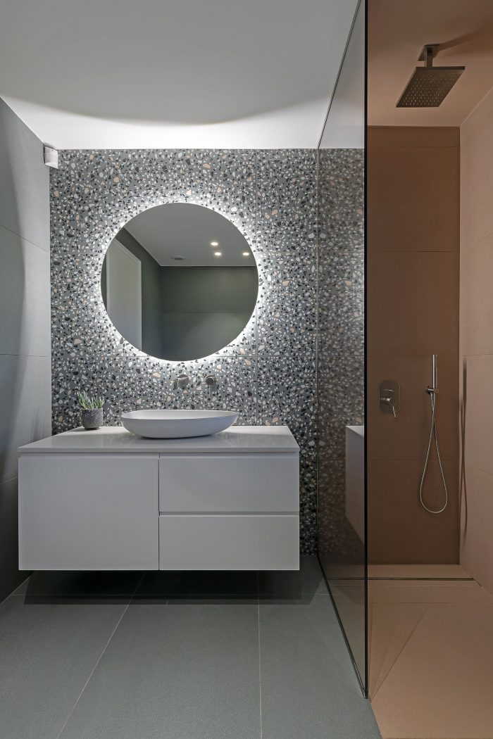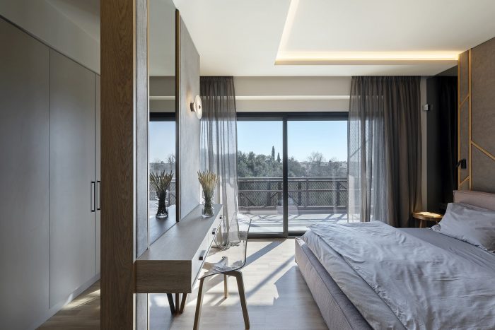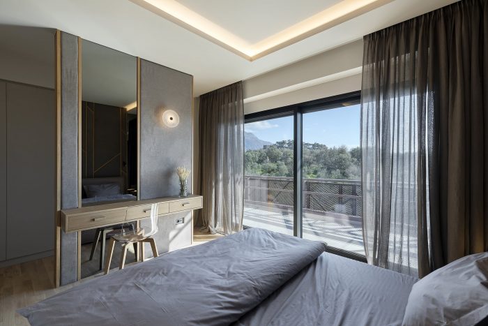 Finally, private rooms on the upper level, with bedrooms, bathrooms, laundry, and bedroom balconies enjoying the view over a lush green area with the castle of Kalamata in the background. Living areas are arranged in an open plan and the different uses are demarcated with a change in the floor material, or with freestanding separating volumes, like the centrally positioned fireplace and the kitchen island.