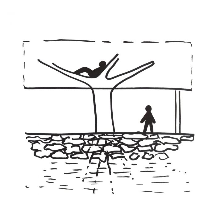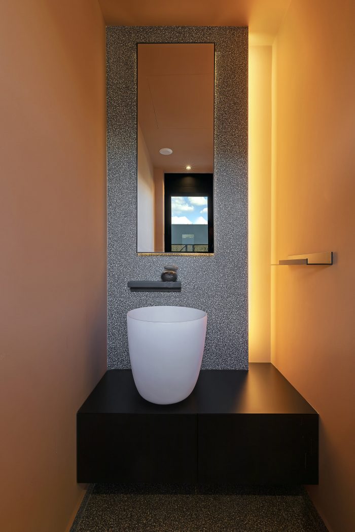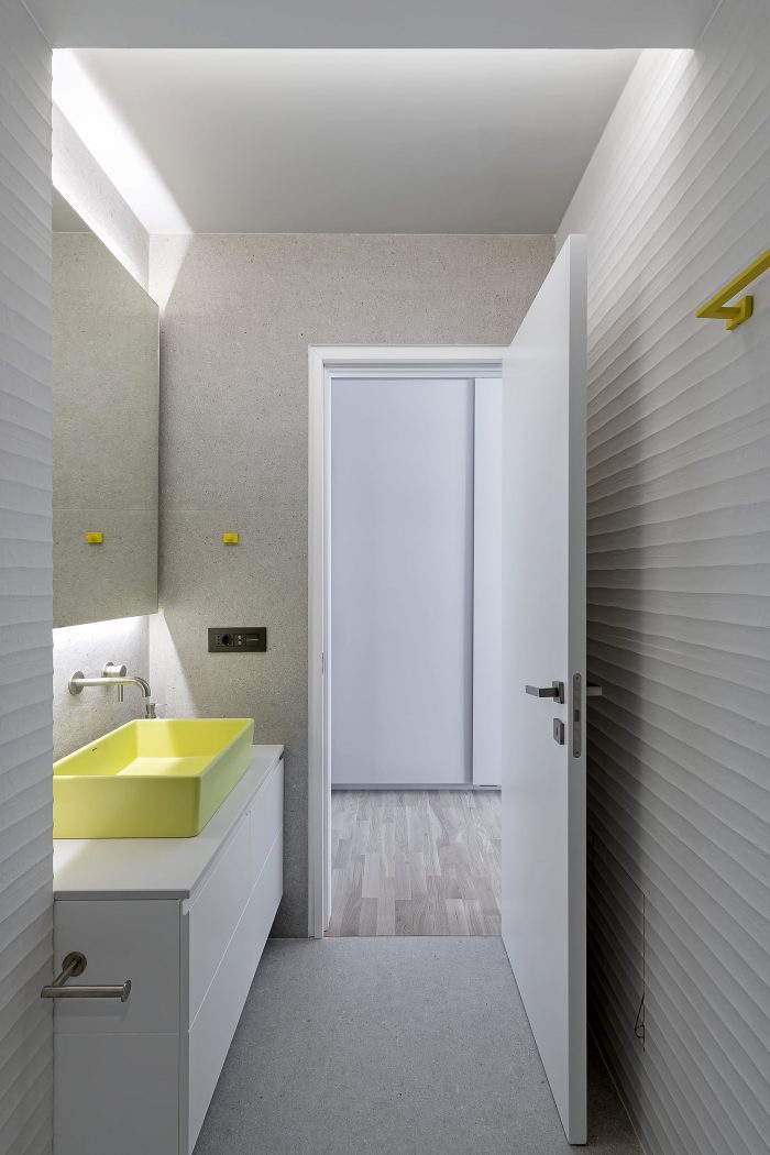 The geometric structure of the building features three irregular horizontal zones. The base, containing the basement, the outdoor spaces, and the swimming pool, appears like a geological formation of rough, untreated stone, becoming a socle to support the consecutive levels of the building. The middle level, on the ground floor, is shaped into an extensive, off-white volume with characteristic openings which evoke a typical house by means of their morphology; the latter, however, is subverted by functional voids contained within.