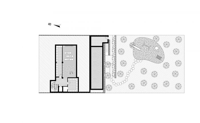最终,建筑的顶部被具体化为一个穿孔的面纱,像一个鸟巢(nidus)一样拥抱着上层的房屋私人空间,栖息在坚硬的建筑体量上。家庭功能在这三层中的分布如下。地下室的服务用途,包括电影室、游戏室、杂物间和储藏室;底层的半公共用途,容纳了生活区和客房。
