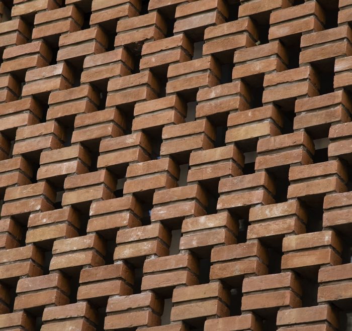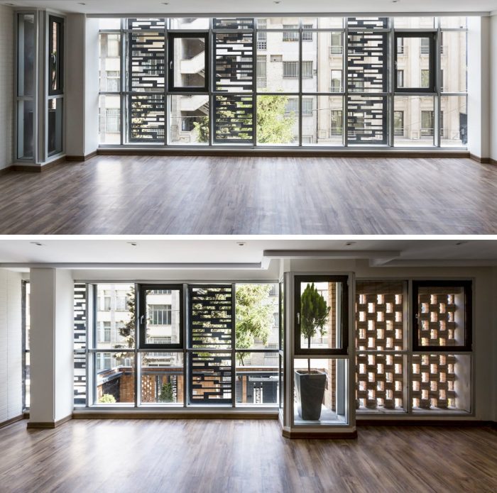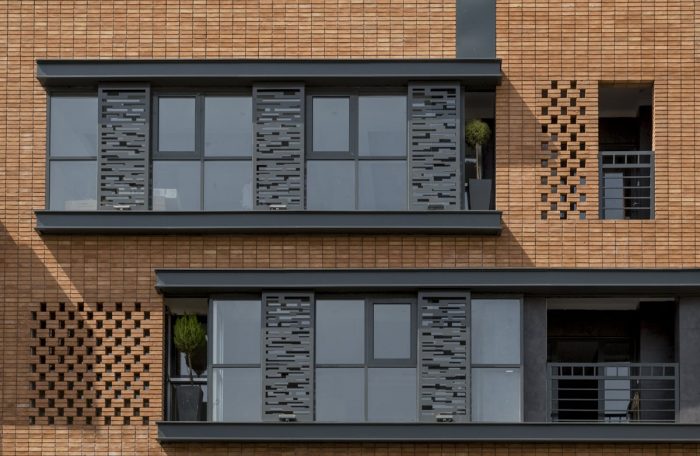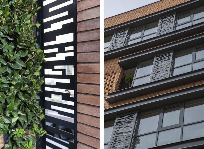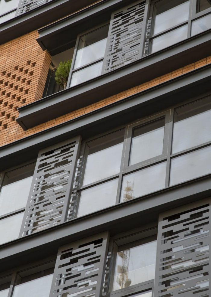 After summing up of the above, the design was made with three steps: (1) To allow light to go to the apartments; (2) To create privacy; and (3) To create appropriate outside views from inside. Therefore, a transparent module and a latticed module were used on every floor to adjust the rate of light penetration into the apartments. On the other hand we considered penetration rate of sunlight into the apartments, adjusted light, created shades, and diversified internal areas by using aluminum latticed plates together with a texture cut by CNC to reduce sunlight during the day and to create pleasant varied spaces for inhabitants with adjustments of shades.