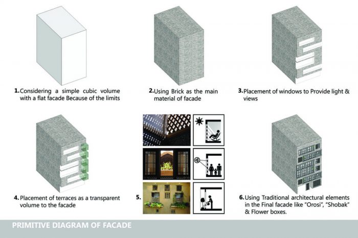 To use traditional patterns to create an architecture consistent with needs of the today’s community; to pay attention to simplicity and homogeneity with the surrounding texture; to use functional elements of Iranian architecture, such as “SHOBAK” and “OROSI” to adjust light and to create privacy at home; and to pay attention to appropriate outside views from inside.