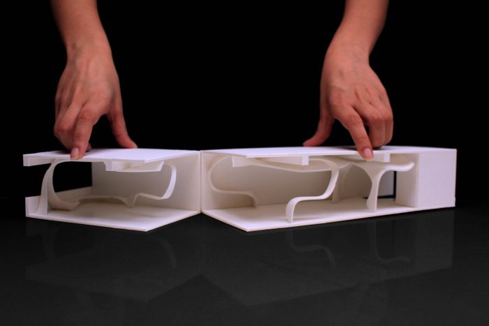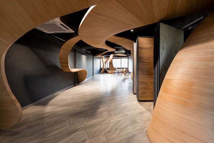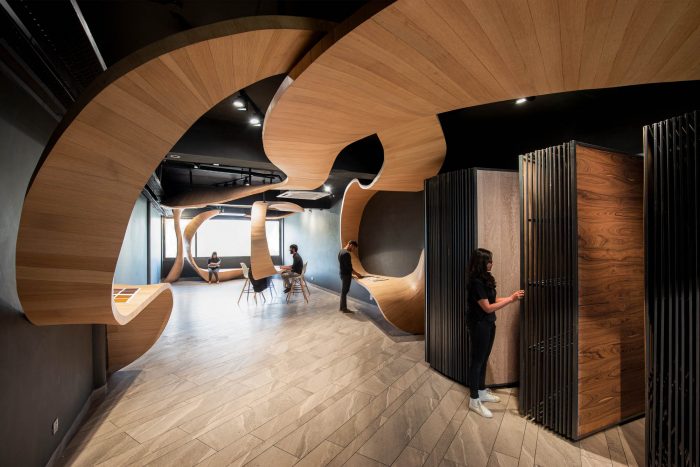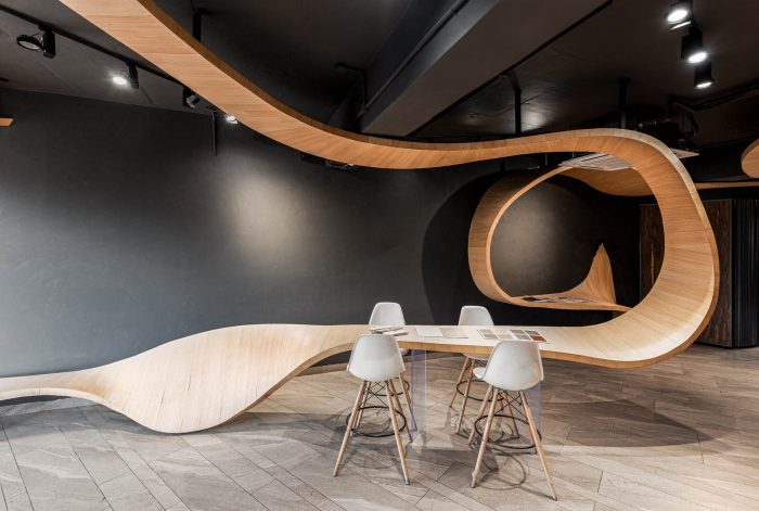 The fluidity of the design in this single-room space feeds a very primal, functional role in the way that these poetic wooden ribbons turn into display shelves, seating spaces and meeting areas, among others. This “art landscape”, as the architects call it, is made up of light oak veneer and is held together by black metal bars. The limitlessness of this design manifests in its ability to blur the boundaries between the static, the movable and the art in-and-on these components of the built space.