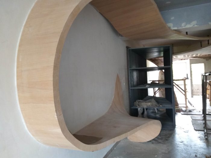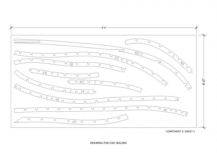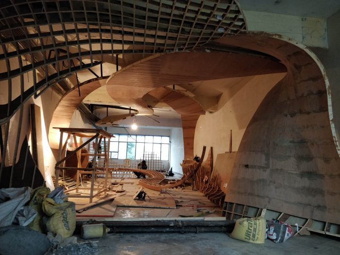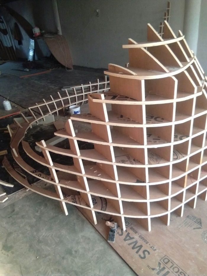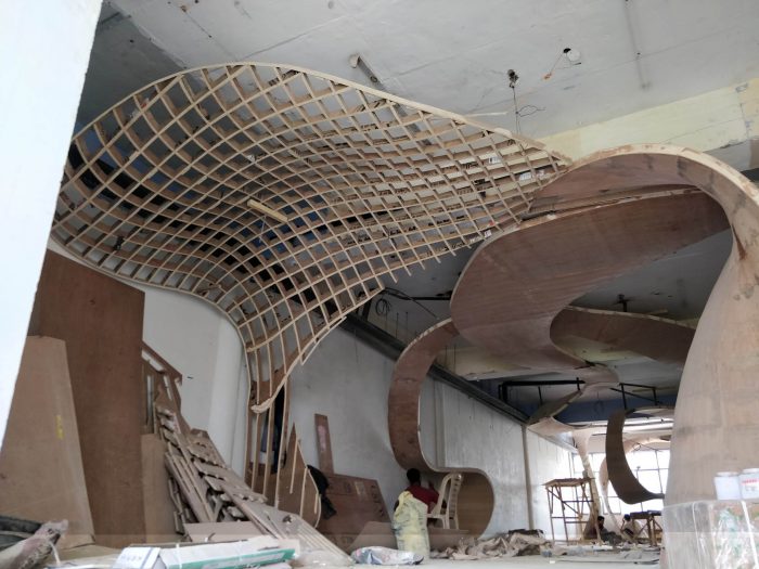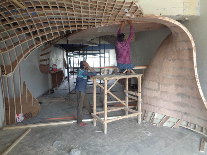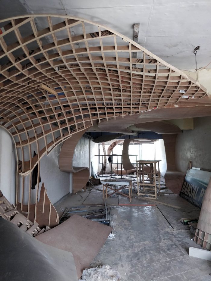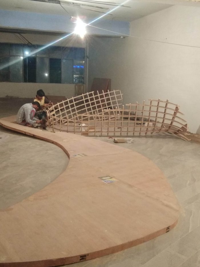 The ribbons were digitally fabricated with the help of a definition in Grasshopper, a computational design tool, which led to the formulation of plywood ribs of doubly-curved geometries that interlocked at 6-inch intervals. This “waffle structure” was then put together with use of 19mm plywood ribs, 3mm Flexi-ply, and 1.5 mm paper veneer—each cut and handled by the carpenters. The craftsmen further jig-sawed the rib in-situ, in unidirectional arrangement. While the technology formulated the development of the design, the carpenters took ownership of the creation with their experience and “telltale knowledge”.