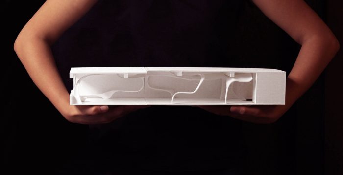 The design problem was posed with an existing 71’ by 18’ linear block in a market complex of the modern city of Chandigarh. SHOP NO. 851 became the voice given to the material sold by the store owner/client—who deals with veneers and plywood, and tells the story of the traditional relationship between the craftsman and wood. The result is an interior-installation instantly poetic: a “spatial matrix” that has evocative ribbons of wood twisting and turning within the space, almost like it has a mind of its own.