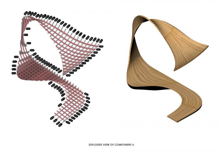 在Grasshopper(一种计算设计工具)定义的帮助下,这些带子被数字化制造出来,这导致了双曲线几何形状的胶合板肋骨的制定,它们以6英寸的间隔交错。这个 "华夫饼结构 "是用19毫米的胶合板肋骨、3毫米的Flexi-ply和1.5毫米的纸皮组装起来的--每个都是由木匠们切割和处理。工匠们进一步在原地用夹具锯开肋骨,呈单向排列。虽然技术制定了设计的发展,但木匠们以他们的经验和 "显而易见的知识 "主导了创作。