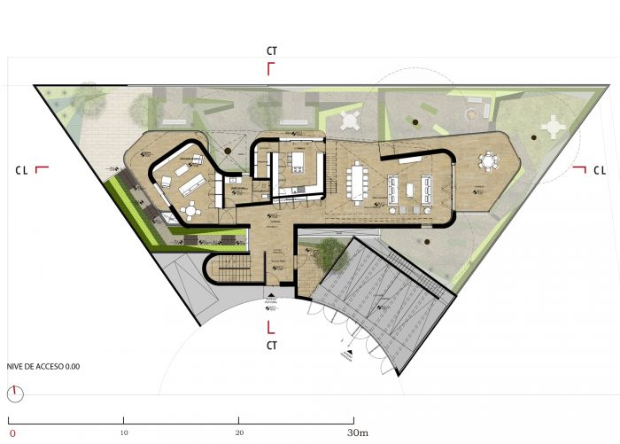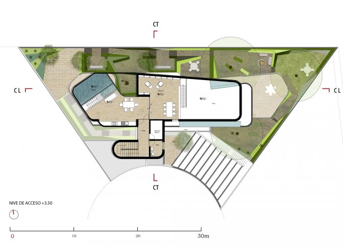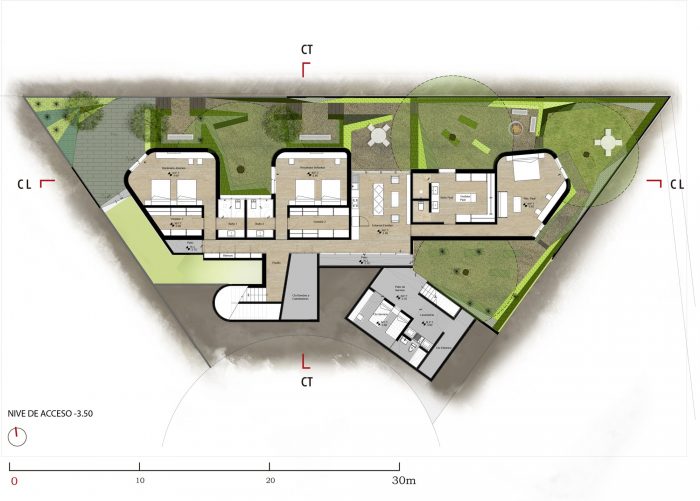 Besides this, the use of crossed natural ventilation, the use of the ground as thermal mass insulation by burying the house partially, and the use of low maintenance vegetation, make an optimal use of water and electrical resources in the project.