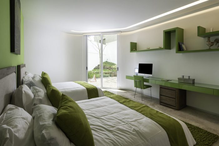 A double height space connects this level with the upper library, studio and pool area with a grill. In the ground level, in touch with the patios, are the bedrooms and the family room, in a more intimate atmosphere.