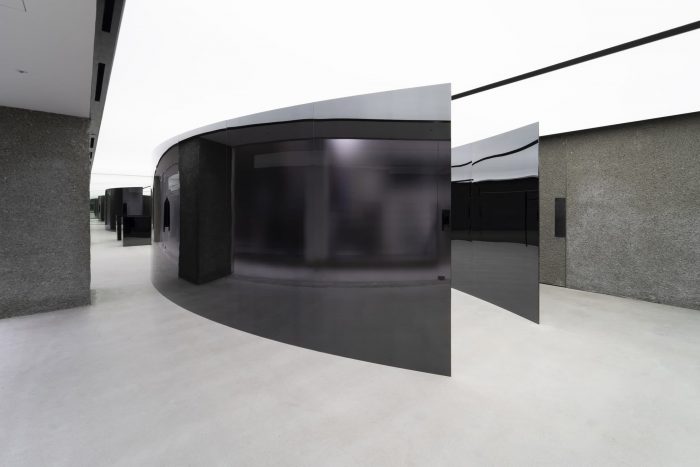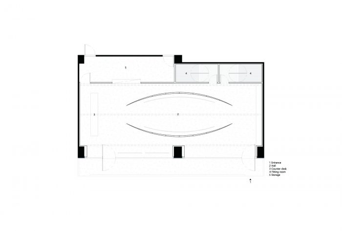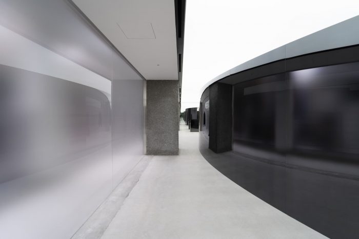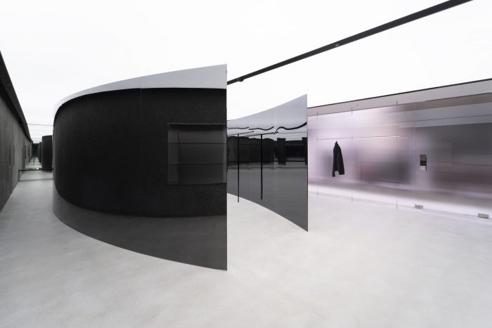 The satin-treated white glass facade was blurred inside and outside, and the rough-concrete wall hid the space behind it as if it had been there since the beginning of the womb. The two curved walls dividing the center serve to clearly partition the display area. This exists to distinguish and emphasize the internal space, just like the concept of ( ) in the sentence. The two curved walls were constructed of reflective surface-treated black stainless steel, which dematerializes the volume of the wall and destroys visual perception. We tried to propose a series of new consumption experiences in the process of these components corresponding to each other in a pure rectangular space and reacting with the outside world.