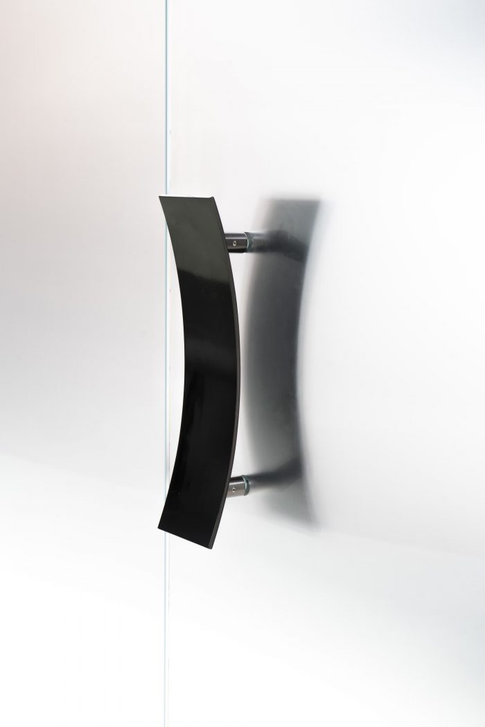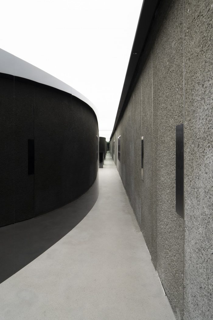 经过缎面处理的白色玻璃外墙内外模糊不清,粗糙的混凝土墙隐藏了后面的空间,仿佛从子宫开始就在那里了。分隔中心的两面弧形墙起到了明确划分展示区的作用。这是为区分和强调内部空间而存在的,就像句子中的( )的概念。这两面弧形墙是由表面经过反射处理的黑色不锈钢建造的,它使墙的体积非物质化,破坏了视觉感知。我们试图在这些组件在纯矩形空间中相互对应并与外界发生反应的过程中,提出一系列新的消费体验。