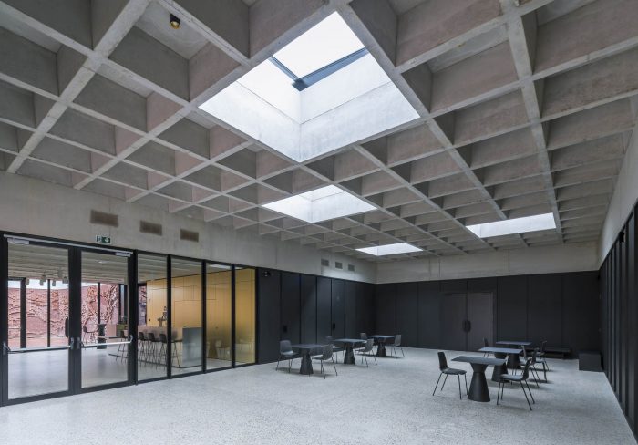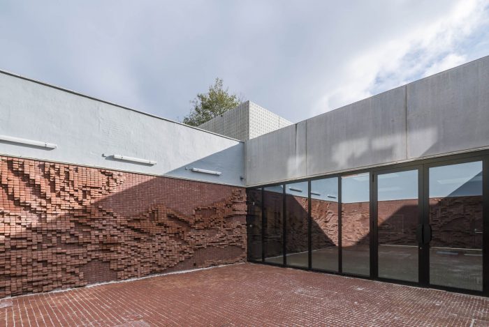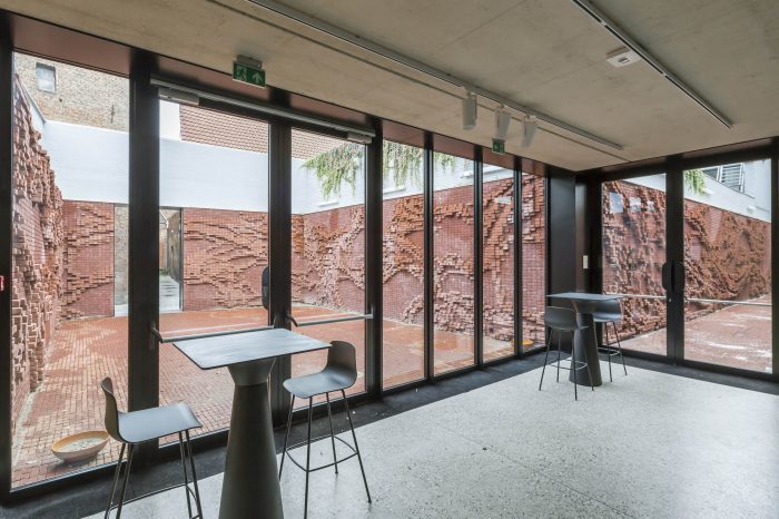 The exterior patios were created in collaboration with artist Nick Ervinck with the concept ‘brick in motion’. The new hall is now a multifunctional concrete box of which the concrete facade is engraved with N O N A, obviously referring to the name of the arts center, but also reminiscing about the former printing factory. The theatre hall is constructed according to the box-in-a-box concept to meet the acoustic requirements of the building. The new building at the street side visualizes nOna, serves as a gate to the inner area, and connects the new site with the existing theatre hall.