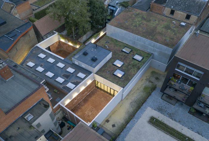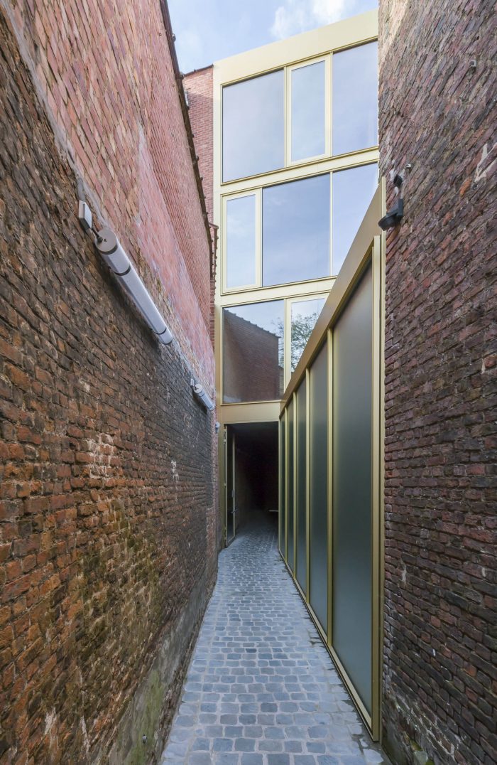 About twenty years ago arts center nOna in Mechelen suffered from a lack of space. The existing Art-deco theatre hall had its limits and was no longer sufficient in terms of flexibility. In 1999 they had the idea to build a second theatre hall on the adjacent printing business site. In the meantime, the printing factory was transformed into three temporary rehearsal rooms for artists in need, called nOva. In 2016 the actual renovation and building of the extension of arts centre nOna started. The project fits in the urban planning of the city of Mechelen to boost the cultural axis between the Grand Place and the congress center Lamot. The site is situated in the middle of a block with a medieval alley that literally separates the new and old site. The new extension got embedded in the urban fabric by the succession of interior and exterior rooms with their own materiality and atmosphere.