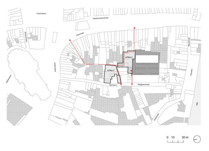 大约二十年前,梅赫伦的nOna艺术中心因空间不足而苦恼。现有的装饰艺术剧院大厅有其局限性,已经不能满足其灵活性。1999年,他们萌生了在相邻的印刷厂地块上建造第二个剧场大厅的想法。同时,印刷厂被改造成三个临时排练室,供有需要的艺术家使用,称为nOva。2016年,艺术中心nOna的扩建工程开始实际改造和建设。该项目符合梅赫伦市的城市规划,以促进大广场和会议中心Lamot之间的文化轴。该地块位于一个街区的中间,一条中世纪的小巷将新旧地块完全分开。新的扩展部分通过内部和外部房间的继承,嵌入到城市结构中,并具有各自的物质性和氛围。