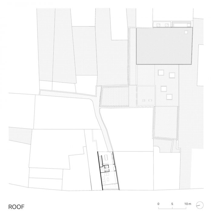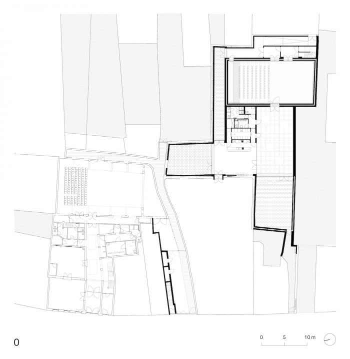 这样,新的场地利用了地块的反复无常的形式,并回应了花园墙和棚子的拼凑。三个天井作为城市的 "房间 "被创造出来,围绕着新的剧院大厅和论坛,这是一个多功能的空间,就像一个有盖的市场大厅。第一个天井位于小巷和接待处之间,连接了Begijnenstraat和内部区域。大天井是论坛的延伸,而长天井则是通往后面的艺术家门厅的通道。宽大的开口模糊了室内和室外的界限。