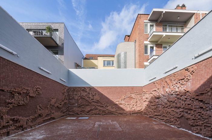 Non-profit organization Onbetaalbaar put a spotlight on every staff member through the creation of QR codes that tell their memories of the building process. During the building process, photographer Kaat Pype took pictures of the workers who were exhibited. Onbetaalbaar also set up a social employment project that resulted in unique door handles. Public buildings in Belgium are obliged to use 1 percent of the building budget for art. dmvA transcends this by considering the art as the building. Artist Nick Ervinck embraced this intention with his work ANONOV which is executed in the exterior patios of the building.