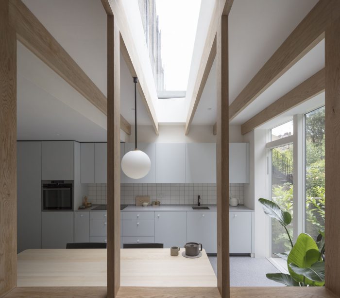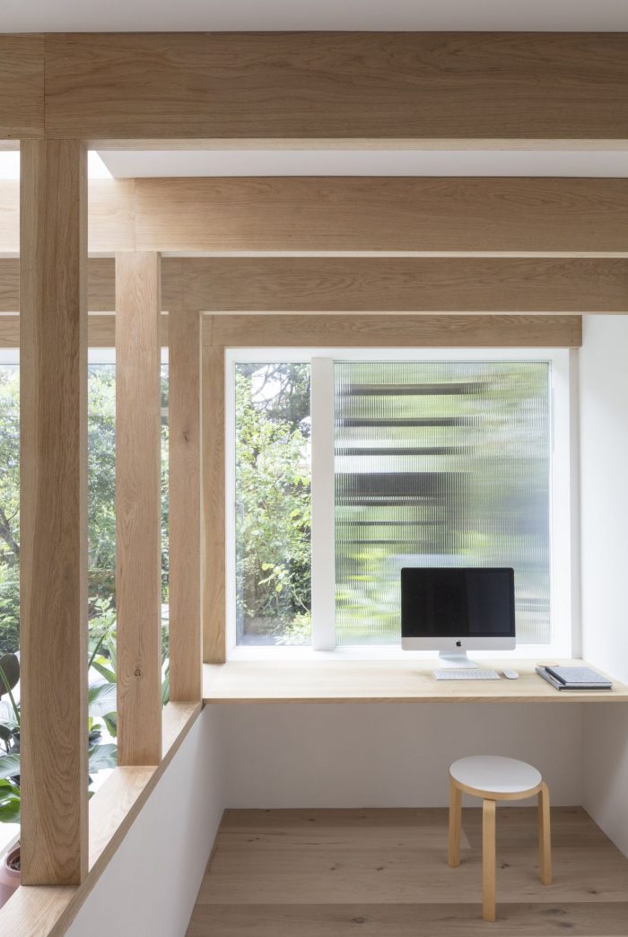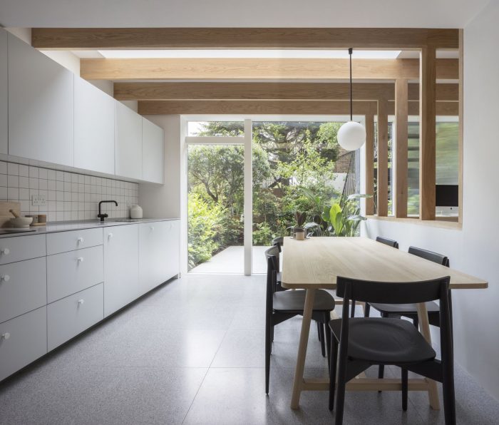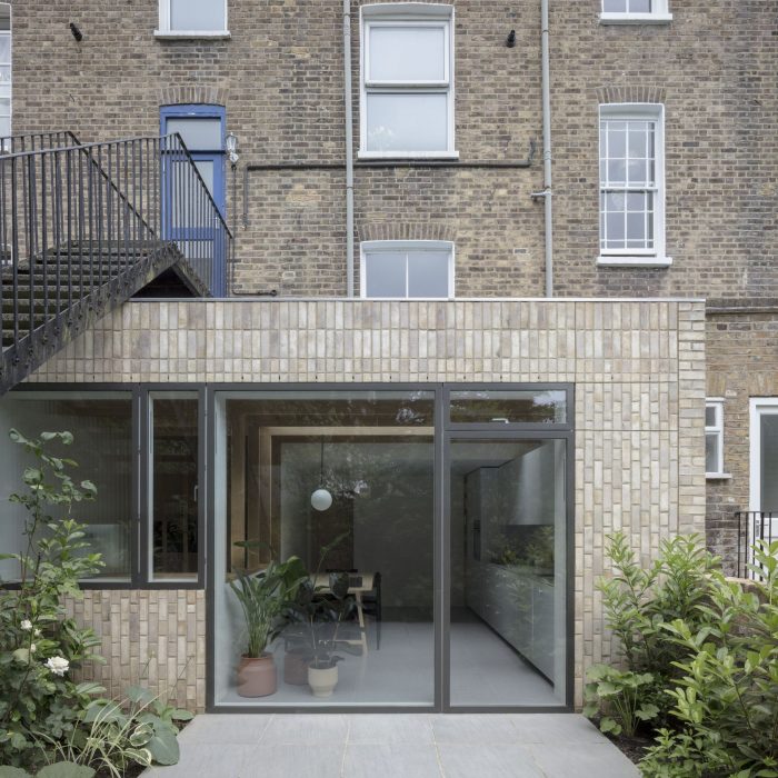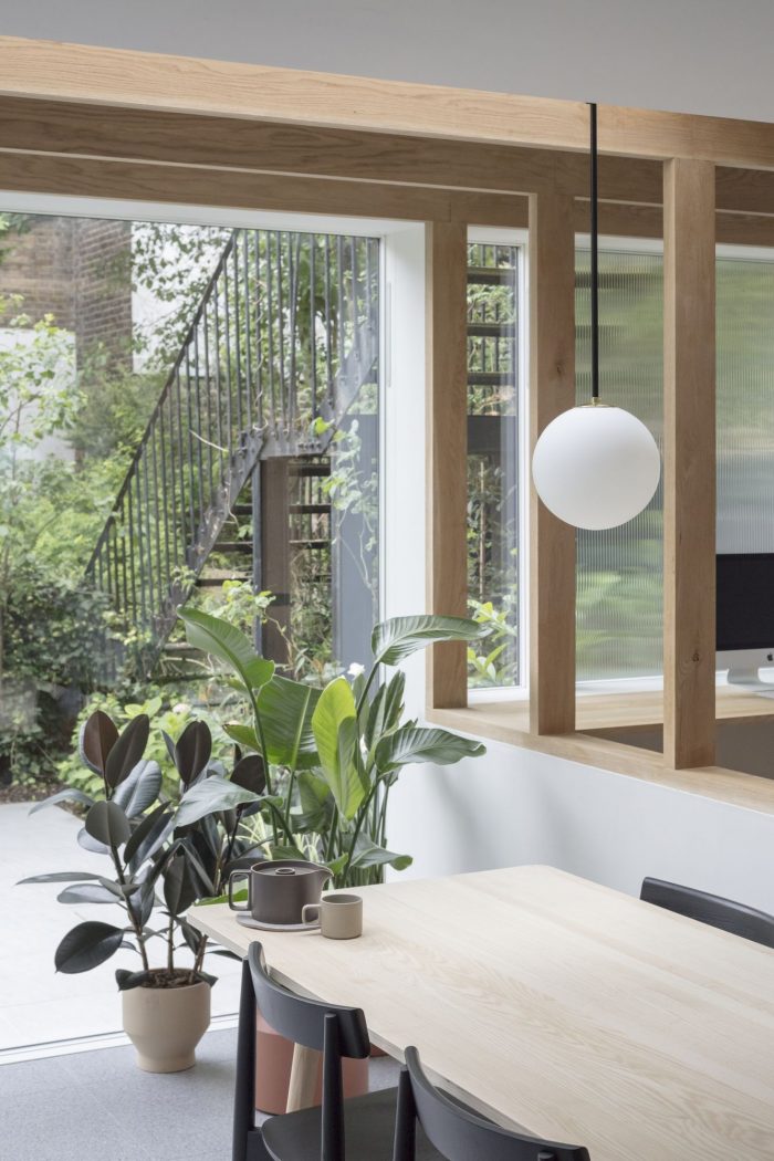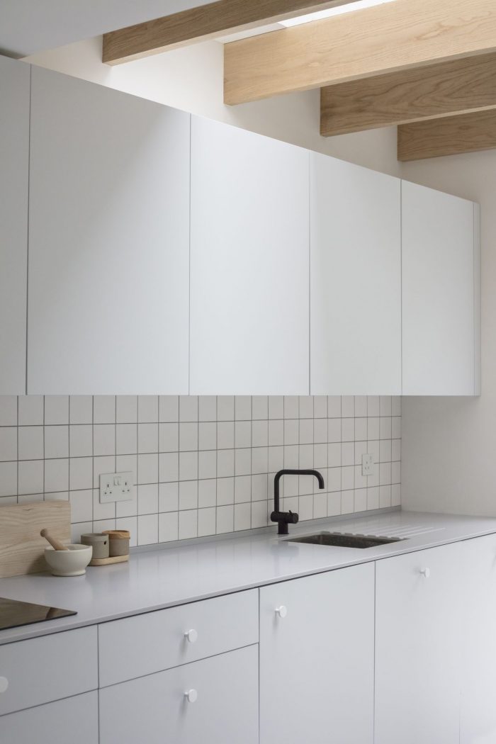 North London House is a minimalist residence located in London, United Kingdom, designed by Architecture for London. This project extends a maisonette that had previously been converted from an early Victorian house. A series of spaces are connected for improved daylight and views. The new kitchen, dining and study spaces are informally defined by exposed oak posts and beams, allowing natural light to penetrate deep into the lower ground floor plan. Framed views are created between the spaces and direct the eye towards the lush green backdrop outside. The orthogonal grid continues throughout the property with bricks in a variety of bonds externally, and square tiles with contrasting color grout lines to the kitchen and bathroom. This contemporary, geometric approach is contrasted with refurbished traditional Victorian details on the upper floor. The depth of the rear extension was defined by an existing upstairs neighbor’s stair, which had to be retained to allow access to their garden. Fluted glass reduces the impact of this stair when viewed from the new study.