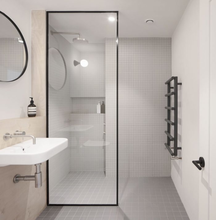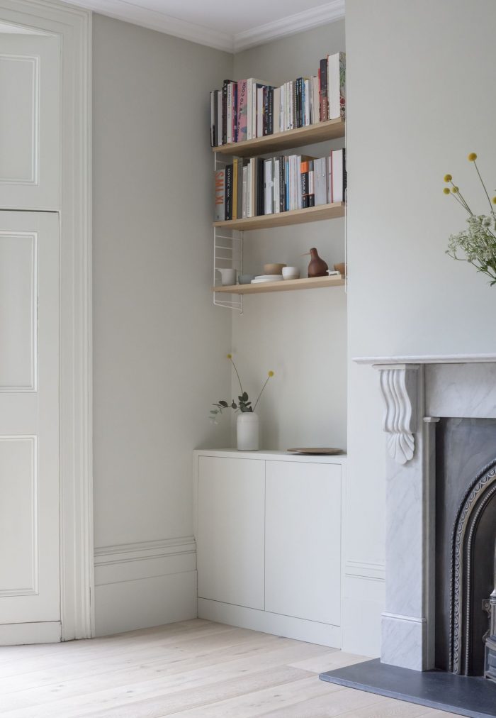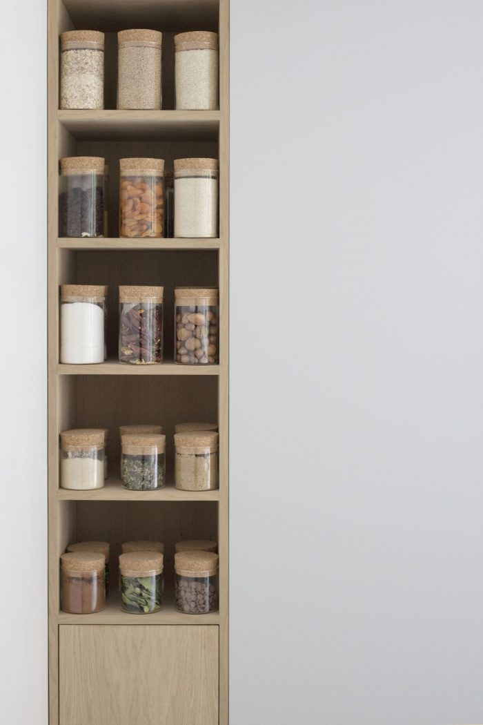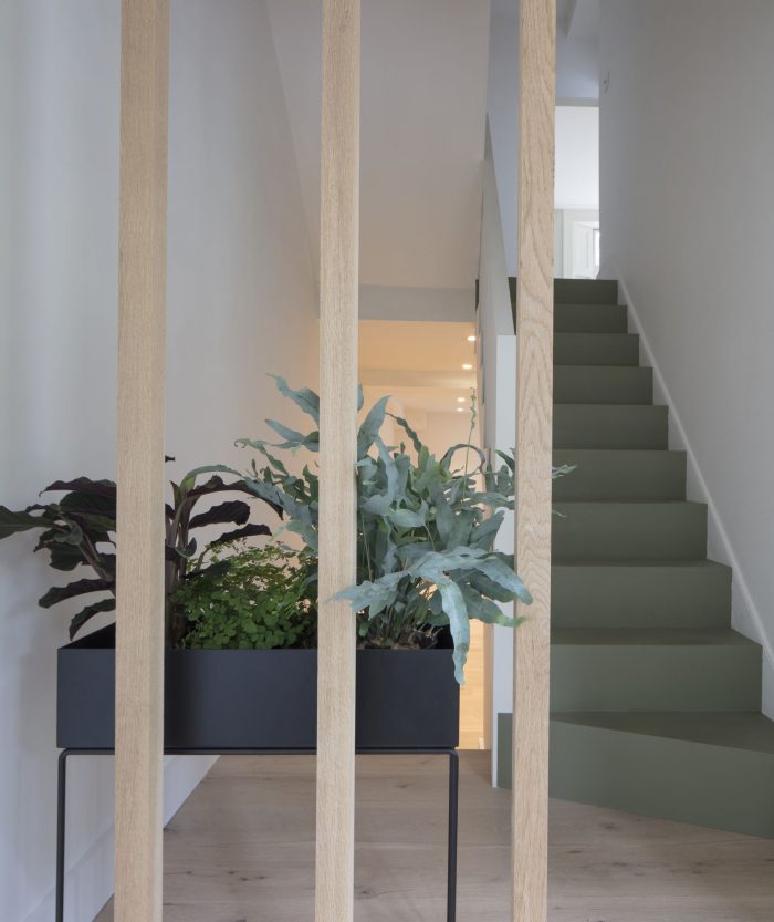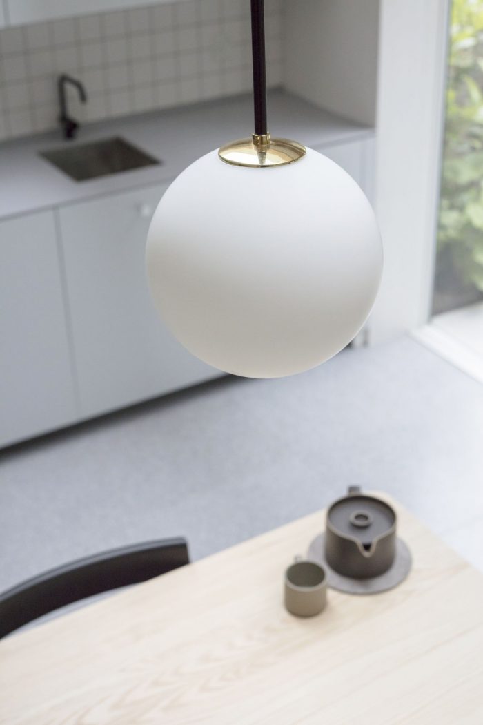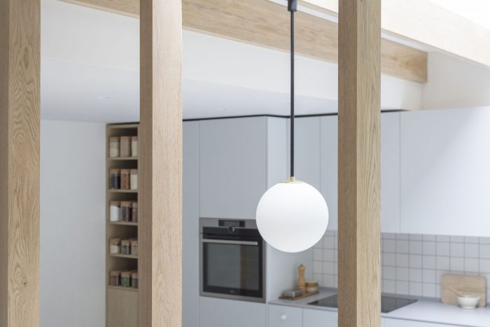 North London House is a minimalist residence located in London, United Kingdom, designed by Architecture for London. This project extends a maisonette that had previously been converted from an early Victorian house. A series of spaces are connected for improved daylight and views. The new kitchen, dining and study spaces are informally defined by exposed oak posts and beams, allowing natural light to penetrate deep into the lower ground floor plan. Framed views are created between the spaces and direct the eye towards the lush green backdrop outside. The orthogonal grid continues throughout the property with bricks in a variety of bonds externally, and square tiles with contrasting color grout lines to the kitchen and bathroom. This contemporary, geometric approach is contrasted with refurbished traditional Victorian details on the upper floor. The depth of the rear extension was defined by an existing upstairs neighbor’s stair, which had to be retained to allow access to their garden. Fluted glass reduces the impact of this stair when viewed from the new study.