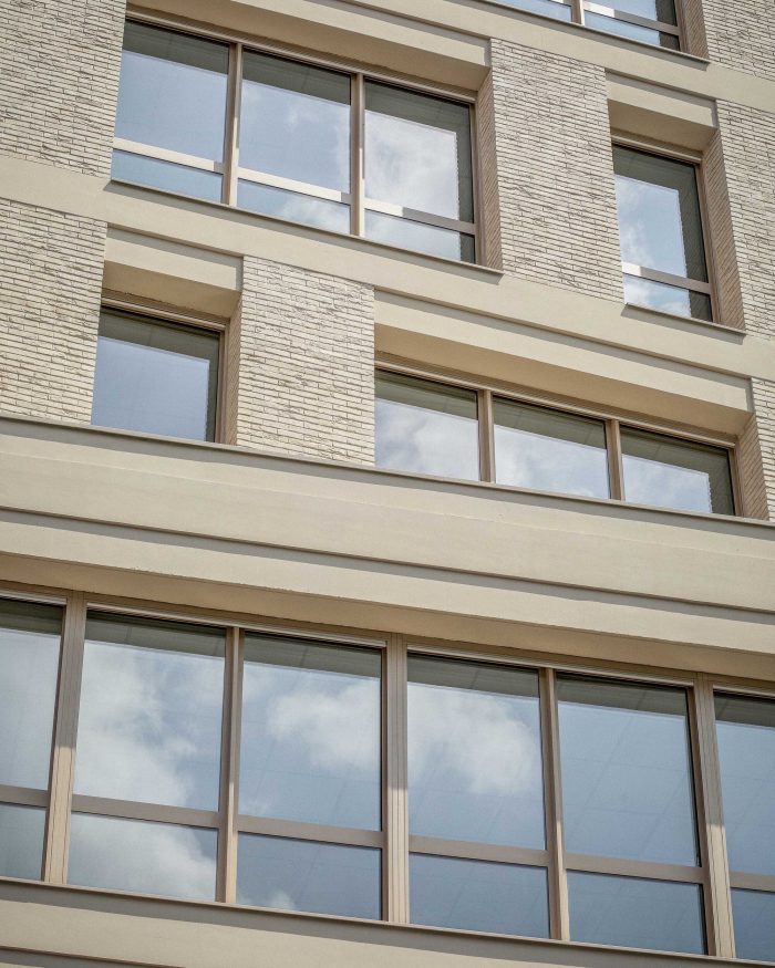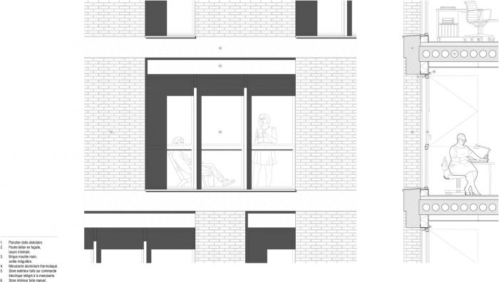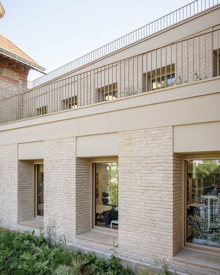 The architecture expresses a specific work on masonry, reinterpreted in a contemporary way in the volumes and the work of the bays. Its materiality, dominated by brick, concrete, and glass, finds kinship within both the establishment and Michel-Ange street. The solid parts are clad with blond, handmade bricks, reminding the color of the Parisian stone. The building levels are marked by stained concrete lines. The bays have a lintel of the same material.