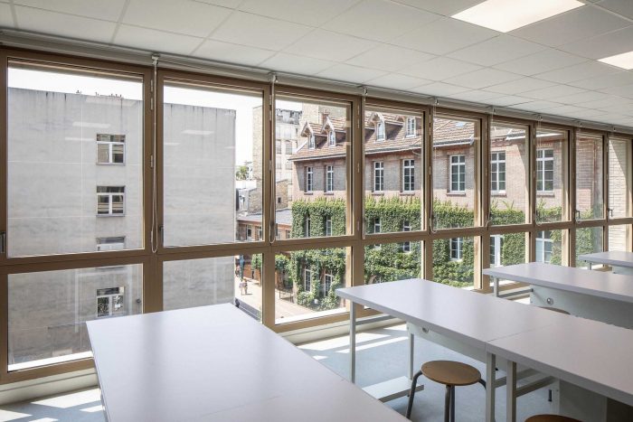 The school stayed open during the construction, which required precise planning on this very dense site. The Institution is implanted in a large urban landscape leading from the Bois de Boulogne to the Seine river, though streets were created in 1862. The new building is becoming a part of the existing built-up front.