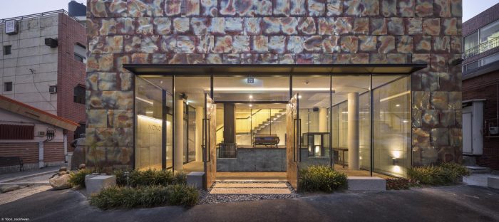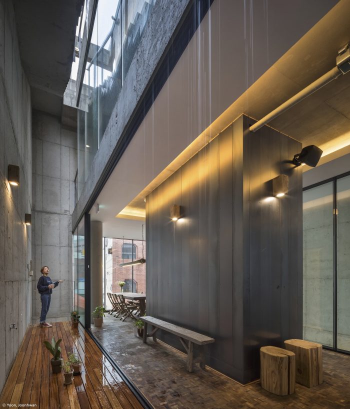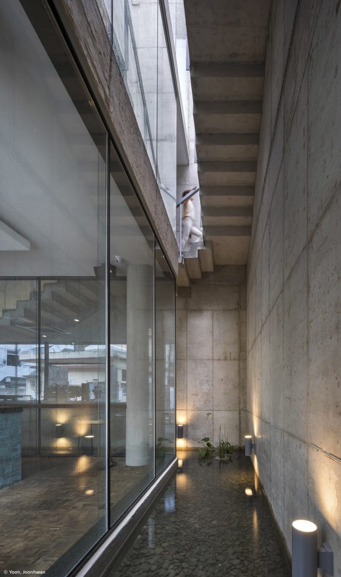 The vertical organization of space was carried out not as simple accumulation, but as zigzag circulatory accumulation. In this way, a variety of interstitial spaces were overlaid between the vertical spaces and the external walls. Also, the vertical stairway was put as an outdoor path in between the interior space and the independent external wall separated from the building, so as to create circulation through the building.