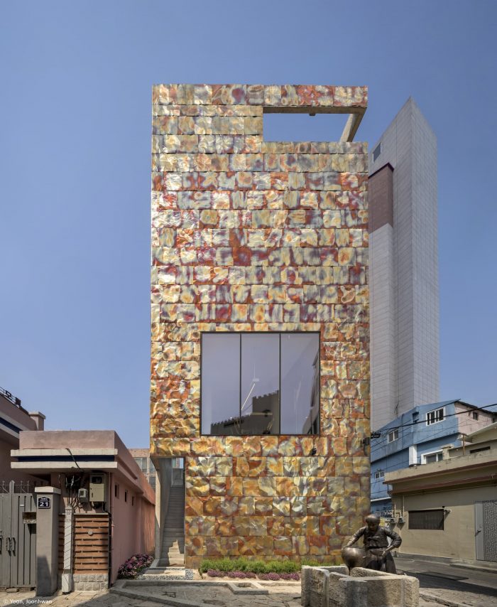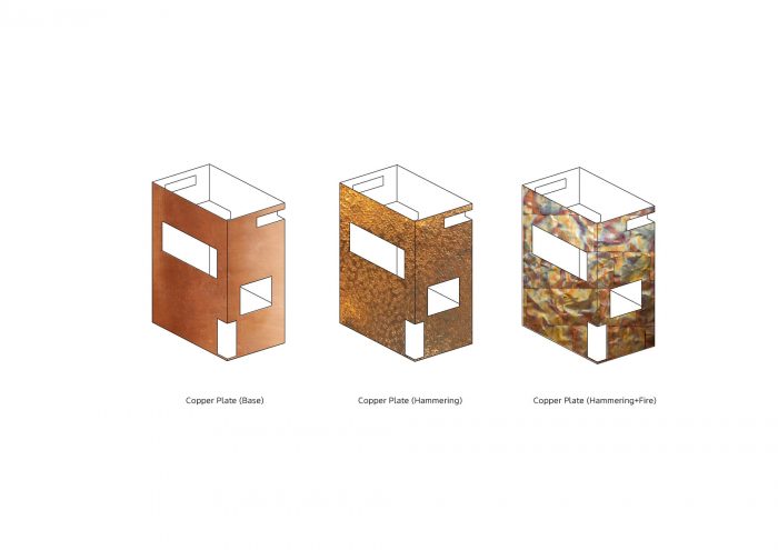 As a small beginning in this way, we intend to suggest a family-run shop with an in-between space where people can understand and connect with others. 1549 sheets of copperplates were formed by the craftsmanship of beating every sheet by human hands so that no plate was shaped the same as another. As copperplates oxidize over time, each of them was baked with fire to diversify the oxidation time.