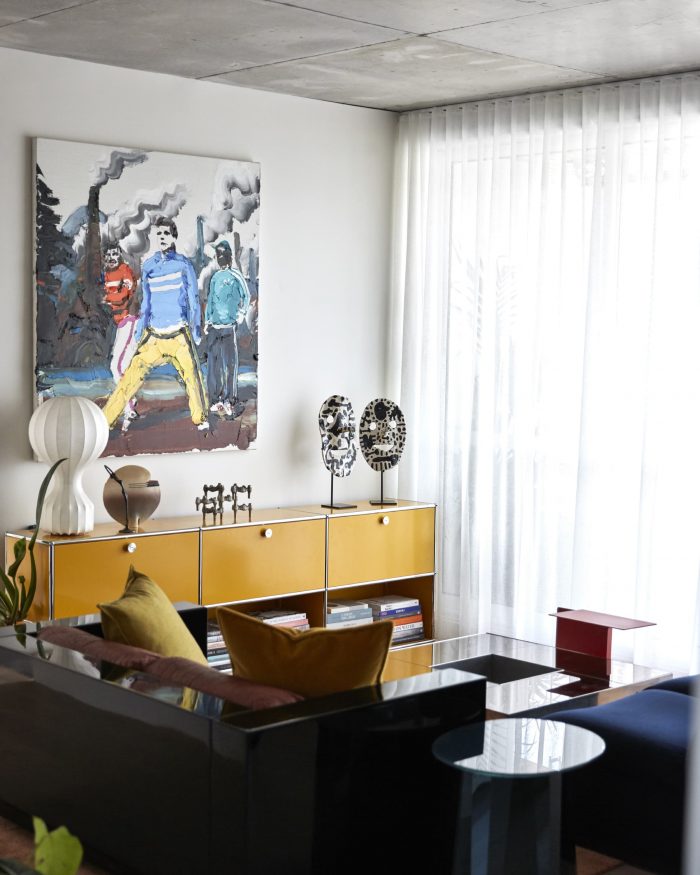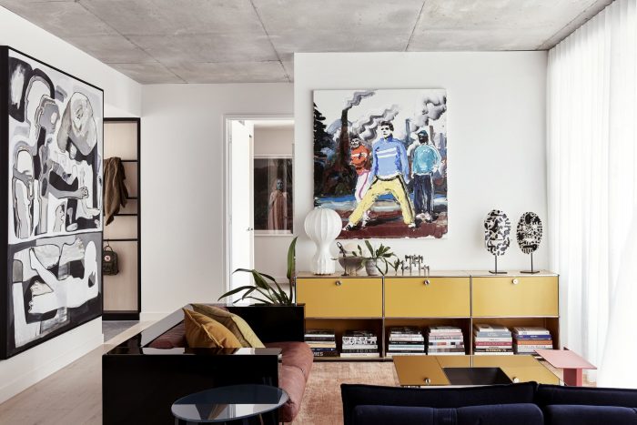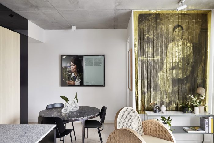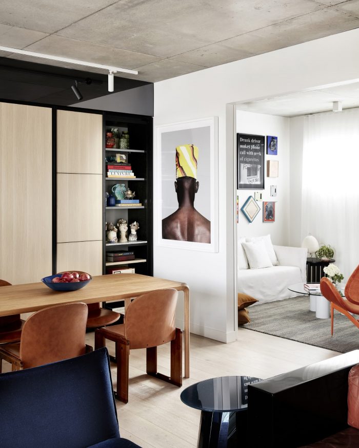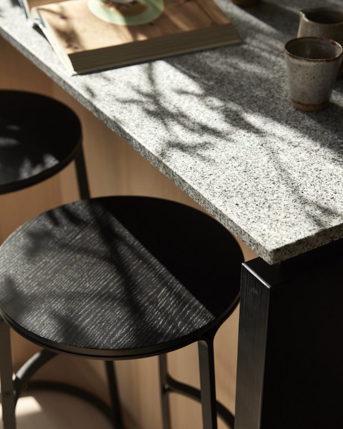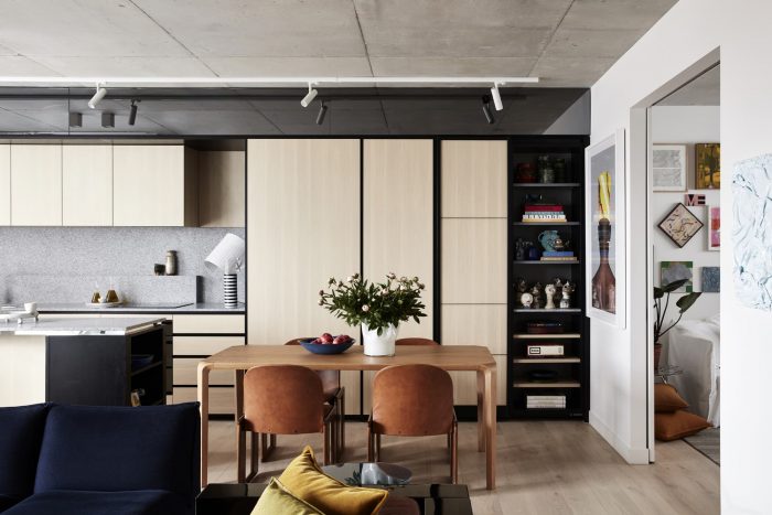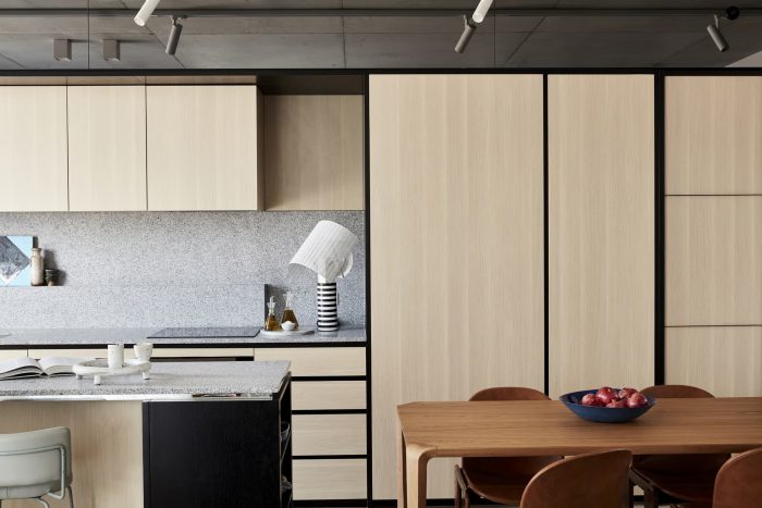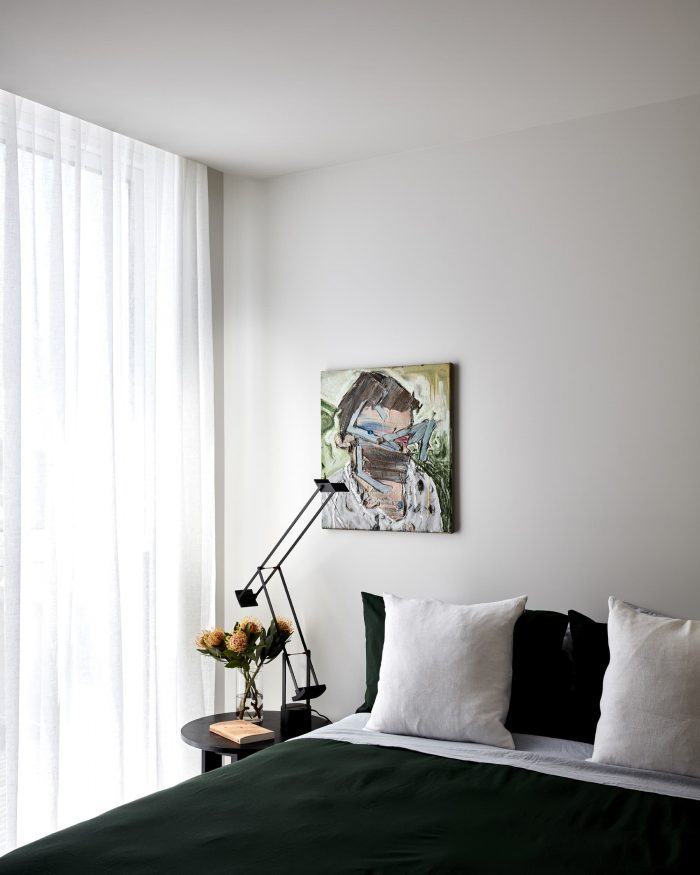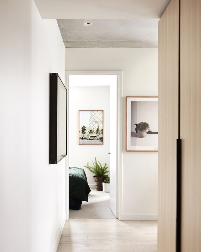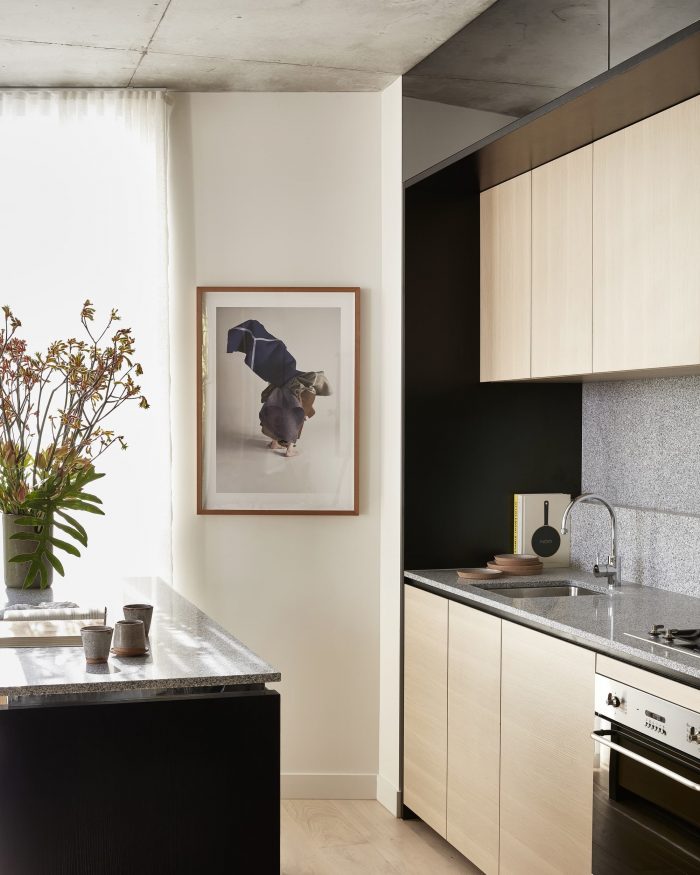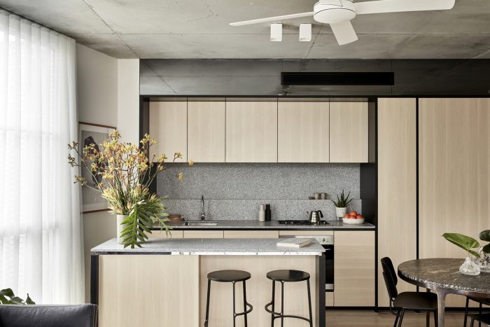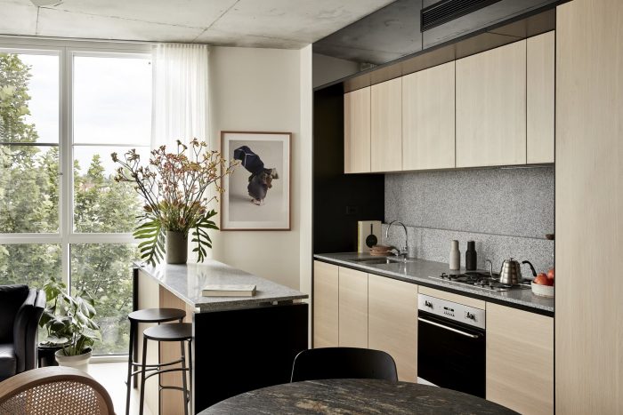 Inside, Flack Studio’s judicious selection of textured and high quality materials and finishes has created tactile living space with seductive aesthetic qualities. Natural stone in the kitchens and bathrooms, and fine detailing and accents throughout each residence achieve a harmonious and polished finish. Clever storage solutions are intuitively designed and made to maximise living space; the sense of space reinforced by 2.8 metre high exposed concrete ceilings.