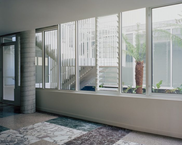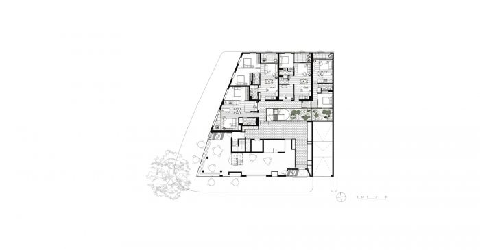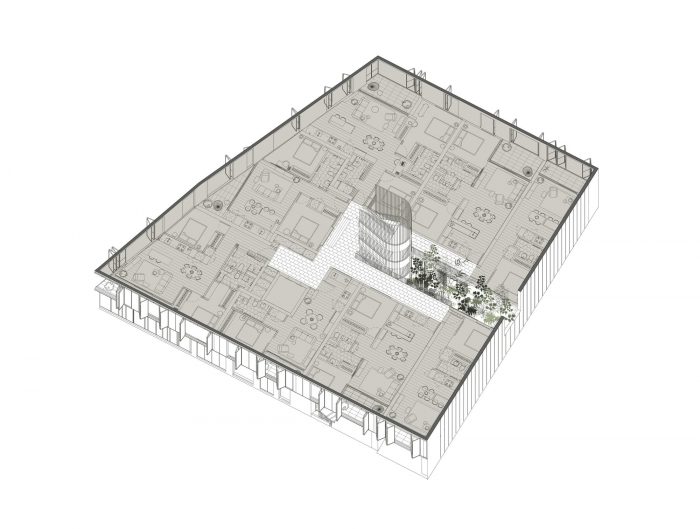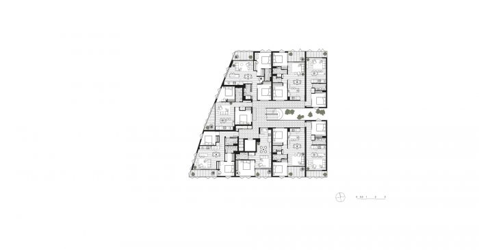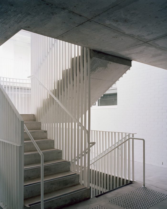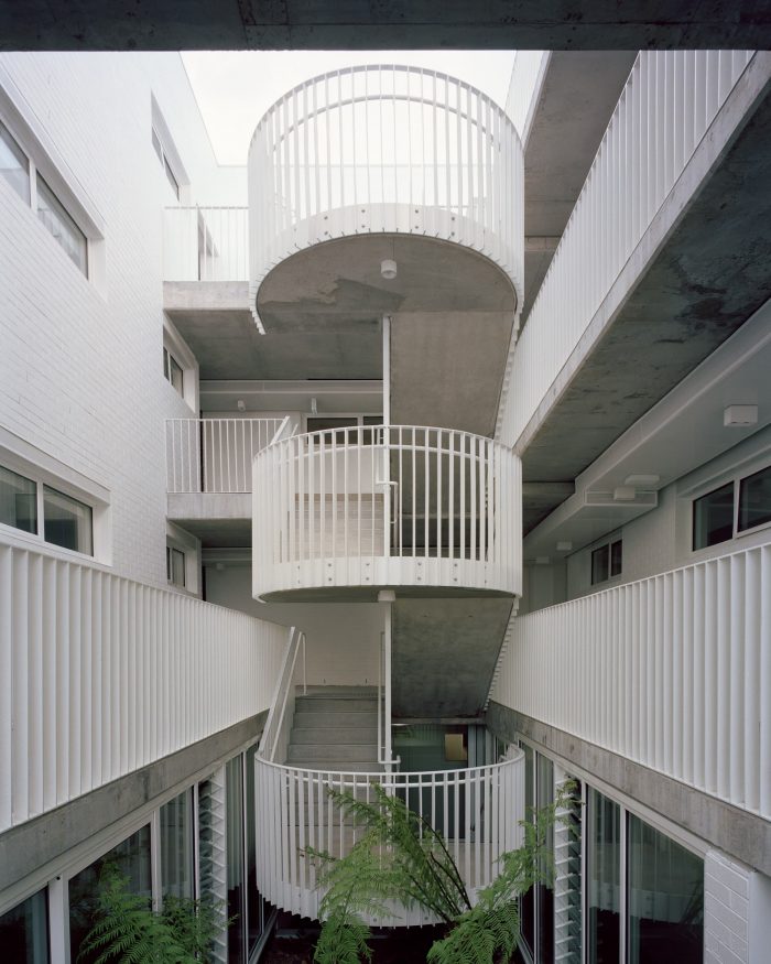 Apartments are connected via a central open-air atrium with shared walkways, greenery and communal areas. Designed to cultivate well being and offer the opportunity for social exchange, the atrium also affords further cross flow ventilation.