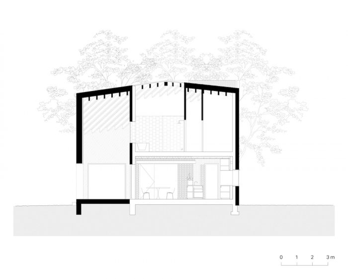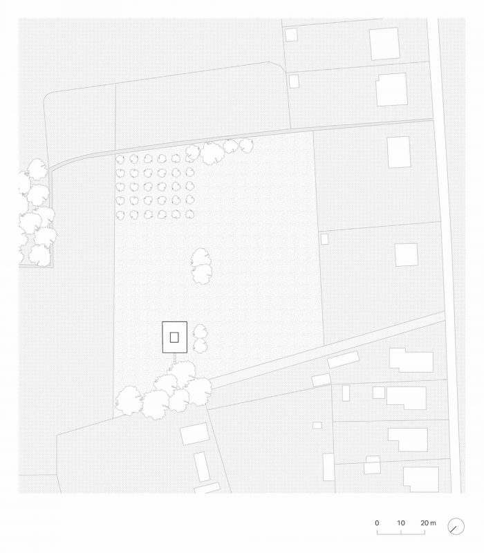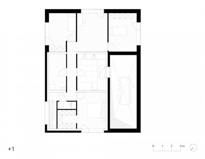 外壳由木材框架结构组成,并完全用瓷砖覆盖。这样,外墙和屋顶就融合在一起,产生了 "第五 "个外墙。瓦片的使用强调了农村和原型的感觉。现有房屋的房间类型学被延伸到新的附加部分。它已经成为一个房间的集合体,包括一个双高的户外空间作为一个有盖的露台和一个带天窗的浴室。由于它的定位,每个房间都与周围的景观有联系。扩建部分的木质框架结构通过裸露的方式被具体化到室内。